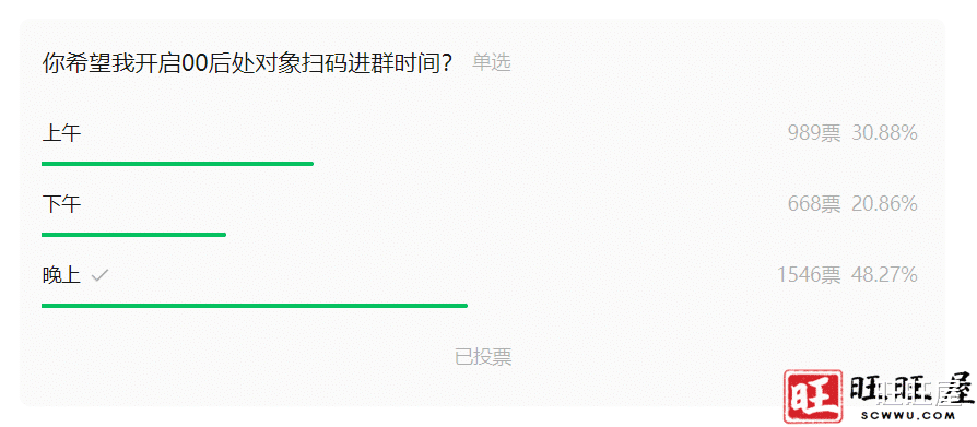 这个投票是为了方便你们扫码进群使用的,因为我一般更新开启扫码进群,一般是在下午,但是你们有的人可能那个时候有事情,因此我后续更新扫码进群,根据你们投票结果进行更新每次的微信群。