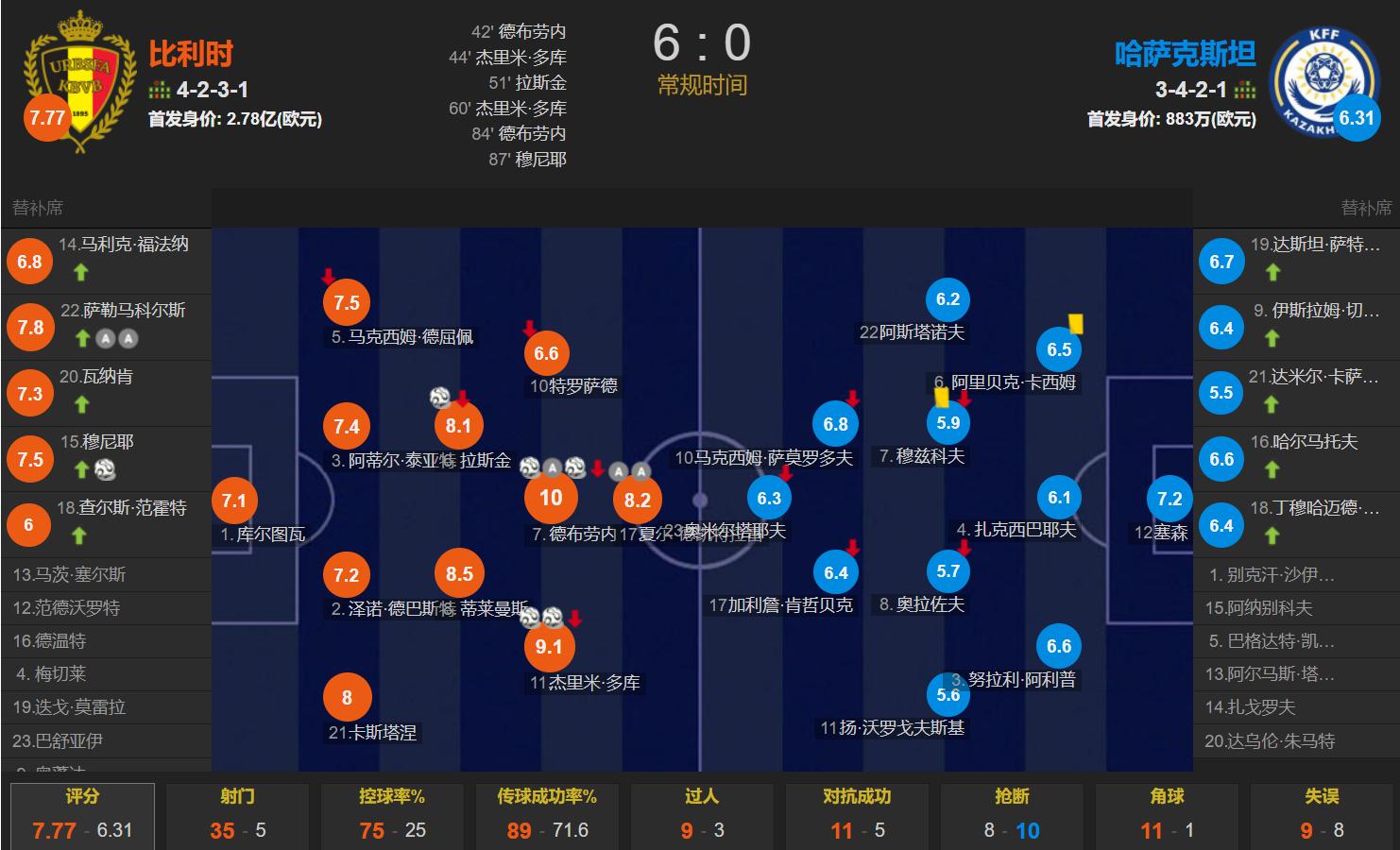 北京时间9月8日凌晨02:45,世预赛欧洲区J组第6轮,比利时主场迎战哈萨克斯坦。此役,曼城弃将、前英超第一中场德布劳内不仅自己梅开二度,还助攻前曼城队友多库破门,一人独造三球,帮助比利时6-0横扫哈萨克斯坦,取得9月份国际比赛日世预赛的两连胜,德布劳内连场破门,廉颇老矣,不,34岁德布劳内还能再战2-3年。
