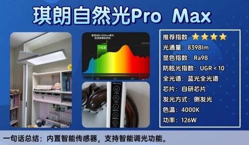 护眼大路灯哪个牌子好?琪朗自然光Pro Max采用侧发光设计,并结合红光补偿技术,不仅降低了有害蓝光的刺激,还提供有益红光,在基础照明表现上,这款灯中心照度达到1390lux,UGR<10的防眩光设计配合Ra99高显色指数,整体的光照不错,此外,琪朗还配备AI智能调光系统,可实时感知环境亮度并自动调整输出光强,但虽然是4000K色温光线,但整体的光感比较暖光,在部分需要场景中,偏暖的光感可能略影响视觉判断。