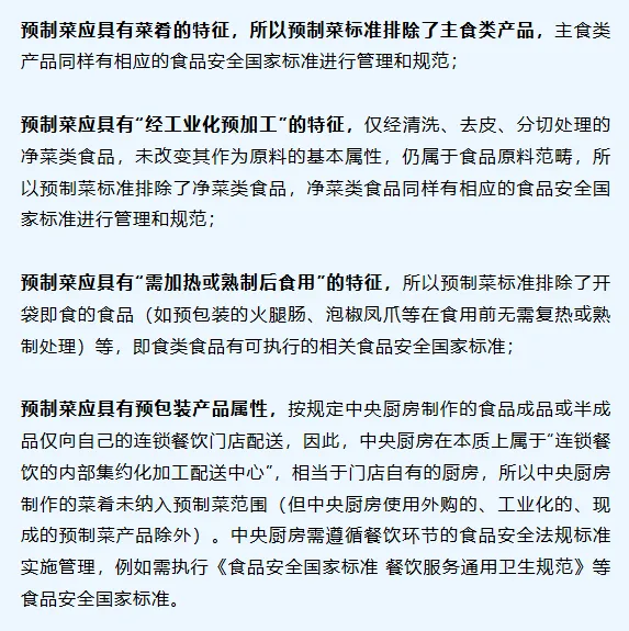 标准起草专家解释说,中央厨房配送至自有门店的菜肴,被视为餐饮环节的延伸,应该按照餐饮相关标准来管理。只有使用外购的、现成的预制菜产品,才属于预制菜范畴。