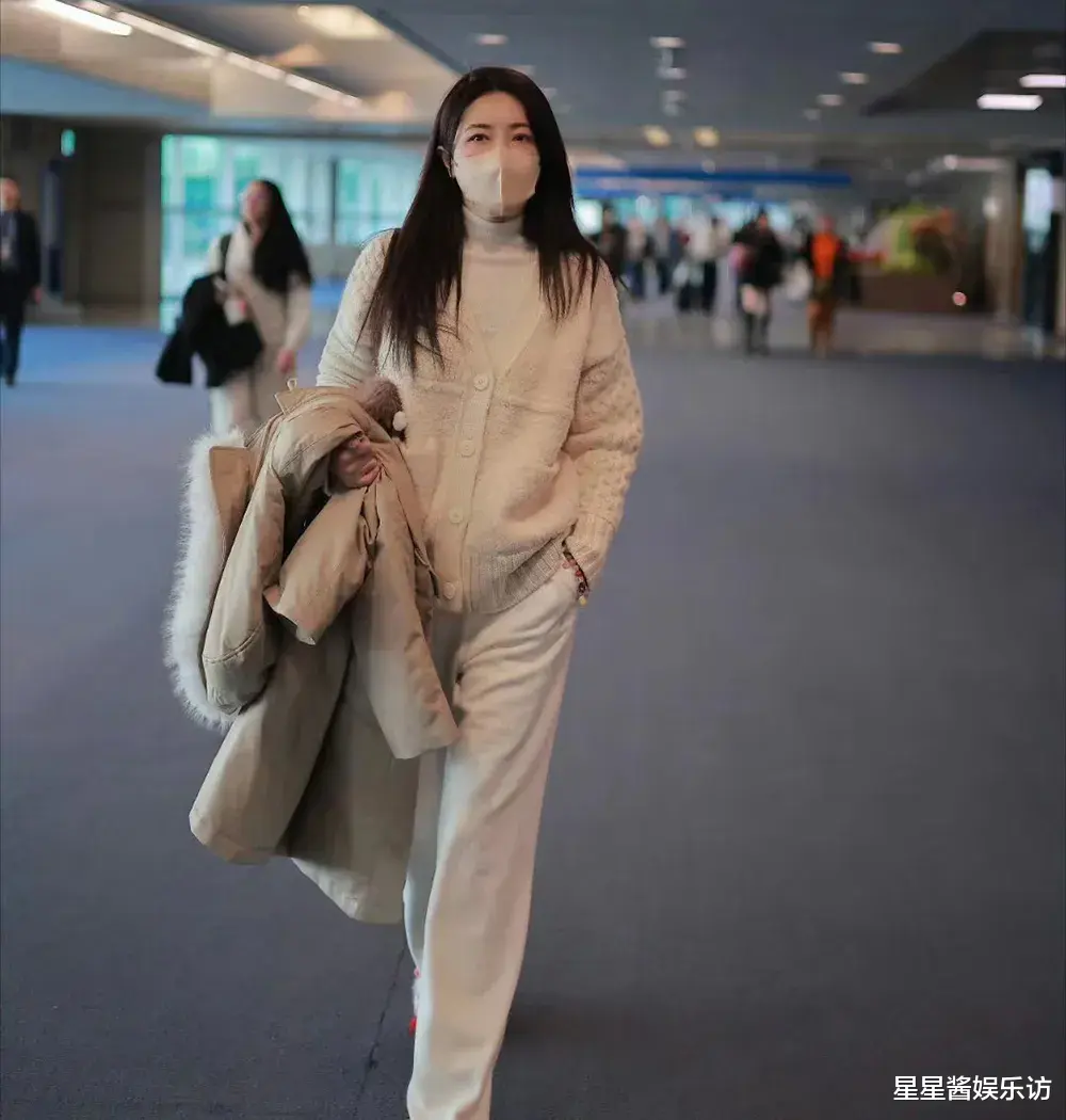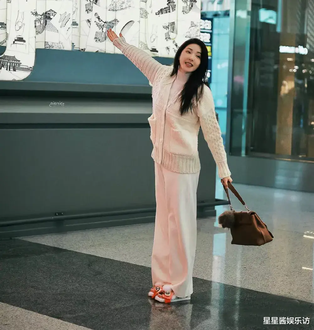 曾黎整套穿搭都软萌软萌,可可爱爱的,一件温柔的毛衣开衫,搭配同色系休闲裤,虎头绣花鞋的红色给整体的搭配多了一抹亮色,看着很突出,但是是好看的。