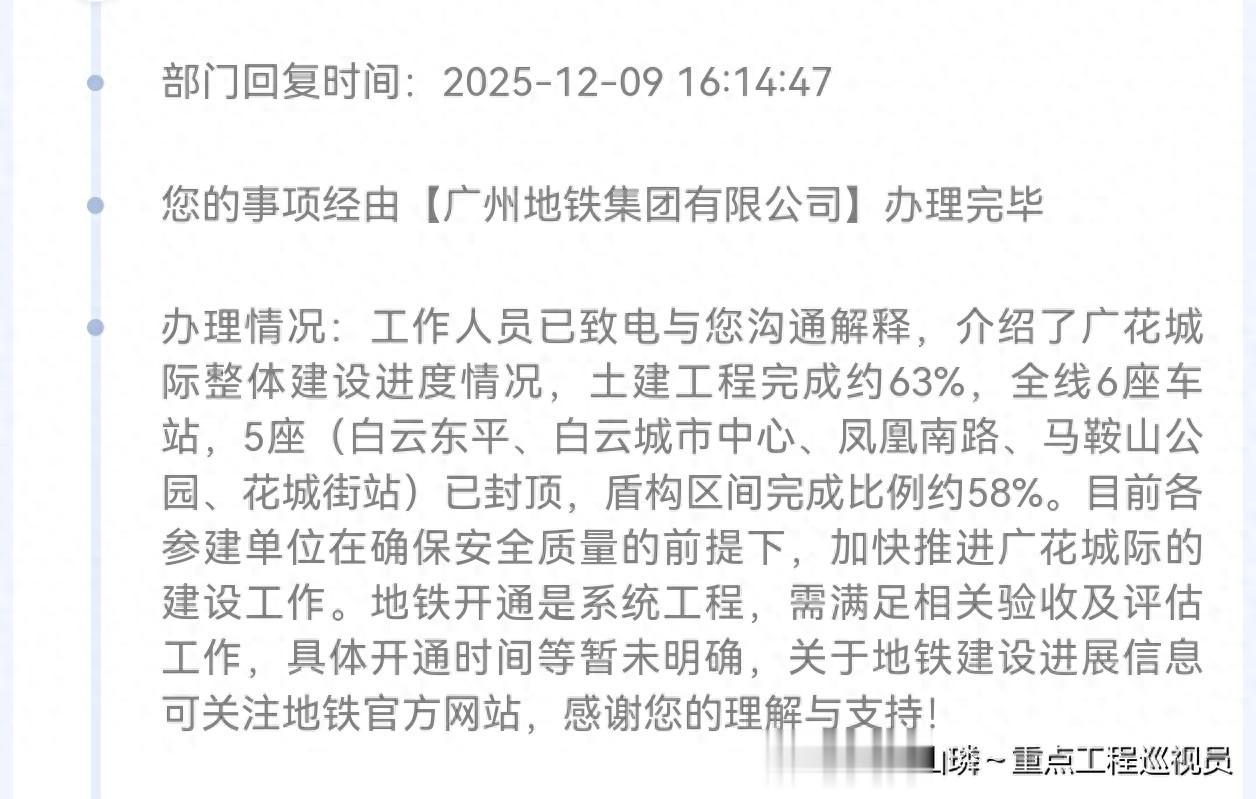 近日,广州地铁公司在接受网友咨询时表示,截至2025年11月底,广花城际土建工程累计完成63%。7座车站中,6座(白云东平、白云城市中心、方石、凤凰南路、马鞍山公园、花城街)主体已封顶,1座(京溪路站)进行土建主体施工。7个区间全部进行土建施工,按隧道长度计算,累计完成58%。各个车站-车站区间隧道均未完全贯通。空港车辆段进行土建施工。