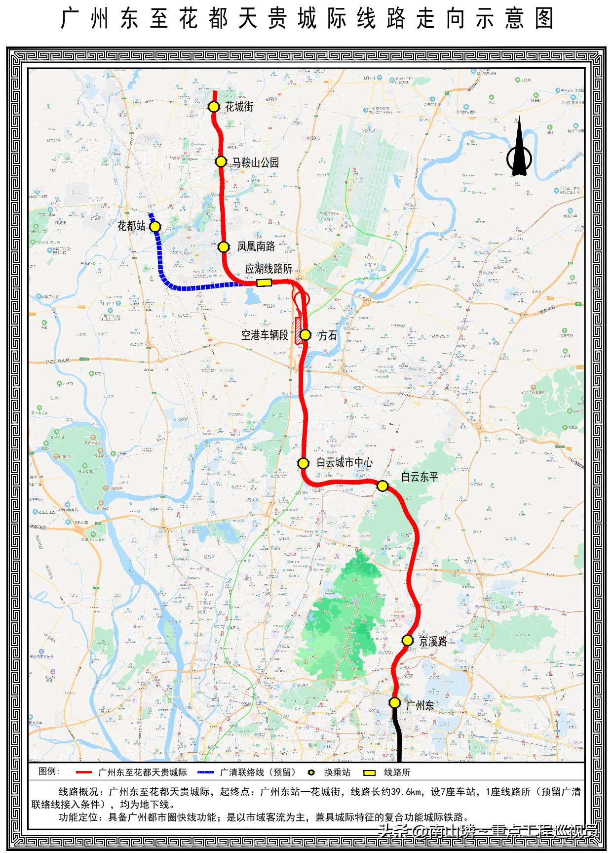 【注】广州东至花都天贵城际铁路,位于广州花都区、白云区和天河区,是广州地铁18号线北延段,南接18号线广州东站,北至花城街站,按160km/h的速度建设。线路长约40公里,全线设8座车站,即广州东站(属于18号线项目,可与广州地铁1/3/11号线换乘)、京溪路站、白云东平站(可与广州地铁14号线换乘)、白云城市中心站(可与芳白城际换乘)、方石站(可与芳白城际换乘)、凤凰南路站、马鞍山公园站(可与广州地铁9号线换乘)和花城街站(可与广州东环城际换乘)等。届时,花城街站至广州东站旅行时间只需30分钟。