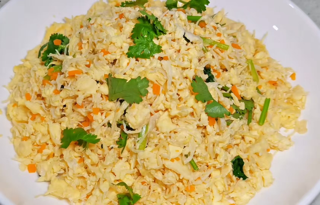 小贴士放最后,照做零翻车:1.葧荠一定要焯水再过冷水,脆度才能锁死;2.胡萝卜别贪多,半根足够,太多会抢蛋味;3.泡贝水去沙后再用,底部沉淀坚决丢弃;4.炒蛋油别省,但也不用多,一勺半足够蓬松;5.蛋液下锅后别疯狂搅拌,推叠法最蓬松,葧荠的脆才不会被搅碎。全程大火快炒,时间越短,葧荠越脆,干贝越鲜。