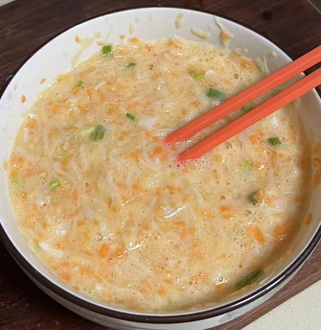 鸡蛋打进碗里,加2勺泡贝水、一点点盐、一小撮白胡椒,再淋半勺香油,筷子快速打到起泡泡。香油是彩蛋,能让蛋块自带坚果香。把干贝丝、胡萝卜丝、葧荠丁全倒进蛋液里,让食材们提前“混个脸熟”,颜色瞬间从单调的淡黄变成彩虹调色盘,黄、橙、白三色在碗里翻滚,看着就心情好,像把春天打成了蛋液。