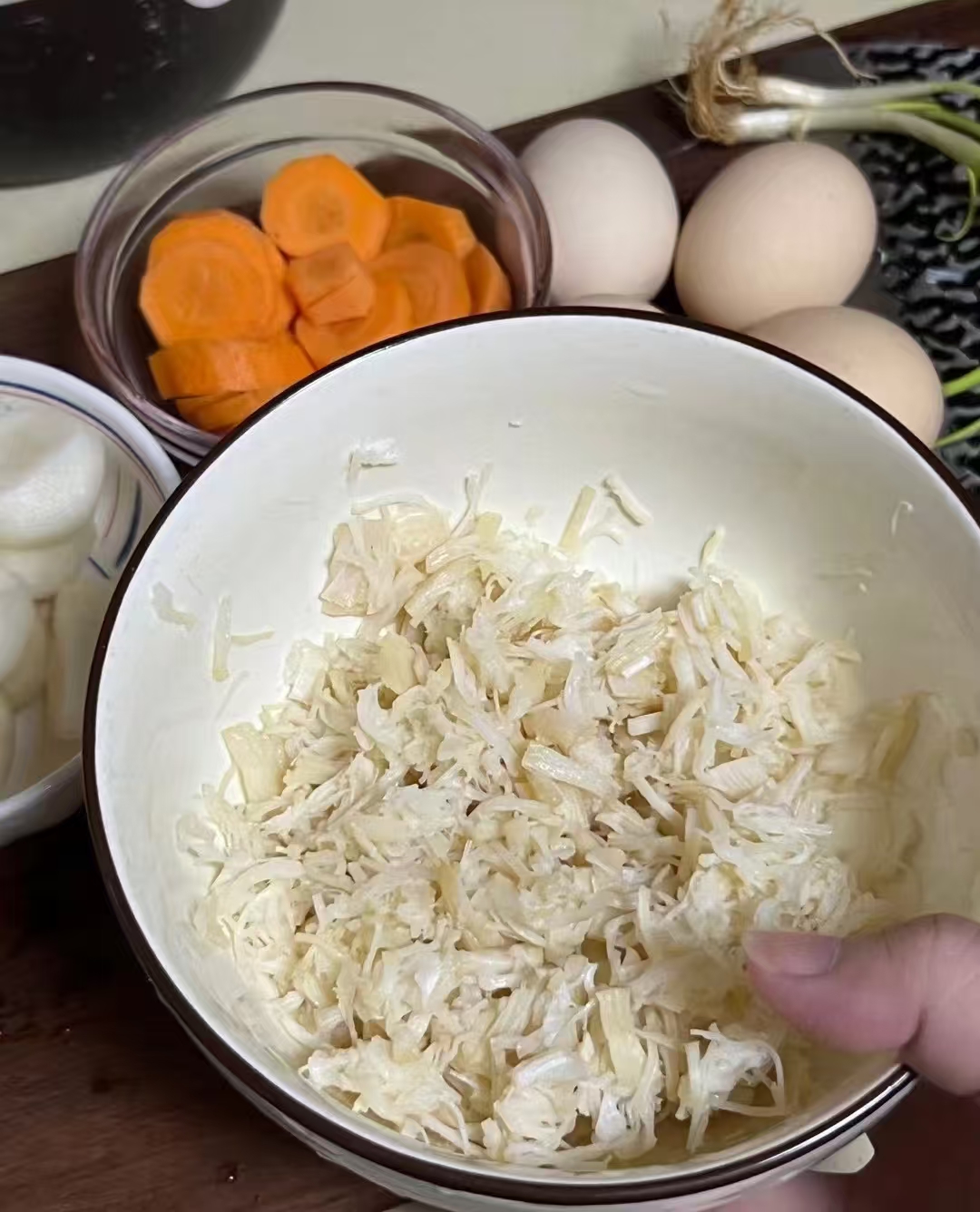 主角四剑客:干贝12粒、鸡蛋3个、胡萝卜半根、葧荠4颗。干贝是鲜味发动机,提前一晚冷水+料酒+两片姜泡上,第二天它就胖成软萌小枕头;着急的用热水20分钟也能救场。泡发后别急着切,用手指顺着纹理撕成粗丝,越粗犷越好,粗的有嚼头,细的能挂蛋,口感才立体。泡贝的水千万别倒,沉底的微量沙粒扔掉,上层清亮液体留着,等会儿让蛋液“喝”个饱,天然味精不花钱。