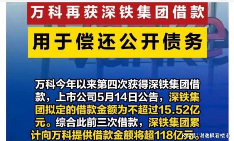 2025年5月21日,根据公告,万科已与深铁集团签署借款合同,并收到深铁集团提供的42亿元借款,三家担保主体提供了信用保证。上半年以来,深铁集团已经4次公开借款支援万科偿债,累计金额达到118.52亿元。