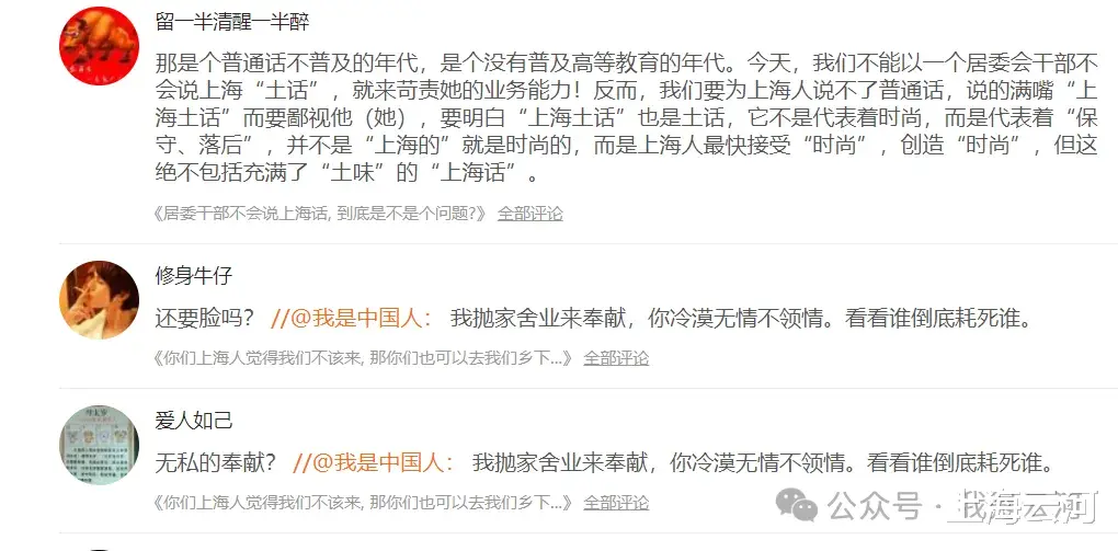 上海话是土话,那四川话、粤语、东北话呢?是不是都得贴上“落后”标签?语言本质是沟通工具,更是地方文化的根。一个人用家乡话交流,就像吃饭用筷子、走路穿鞋一样自然。非要扯上“时尚”或“土味”,那是把语言当成了攀比的奢侈品。而且他已经做出了他自己的判决:上海话代表着“保守、落后”。