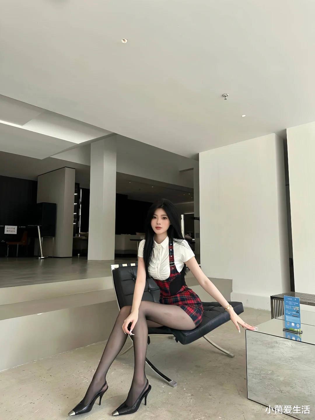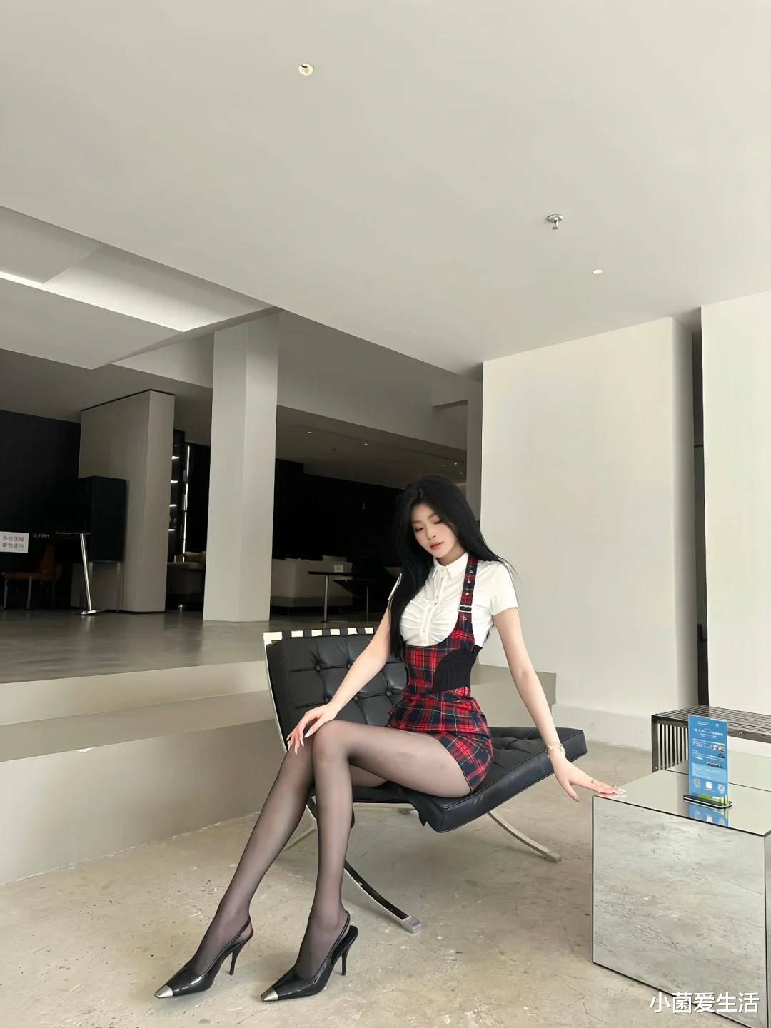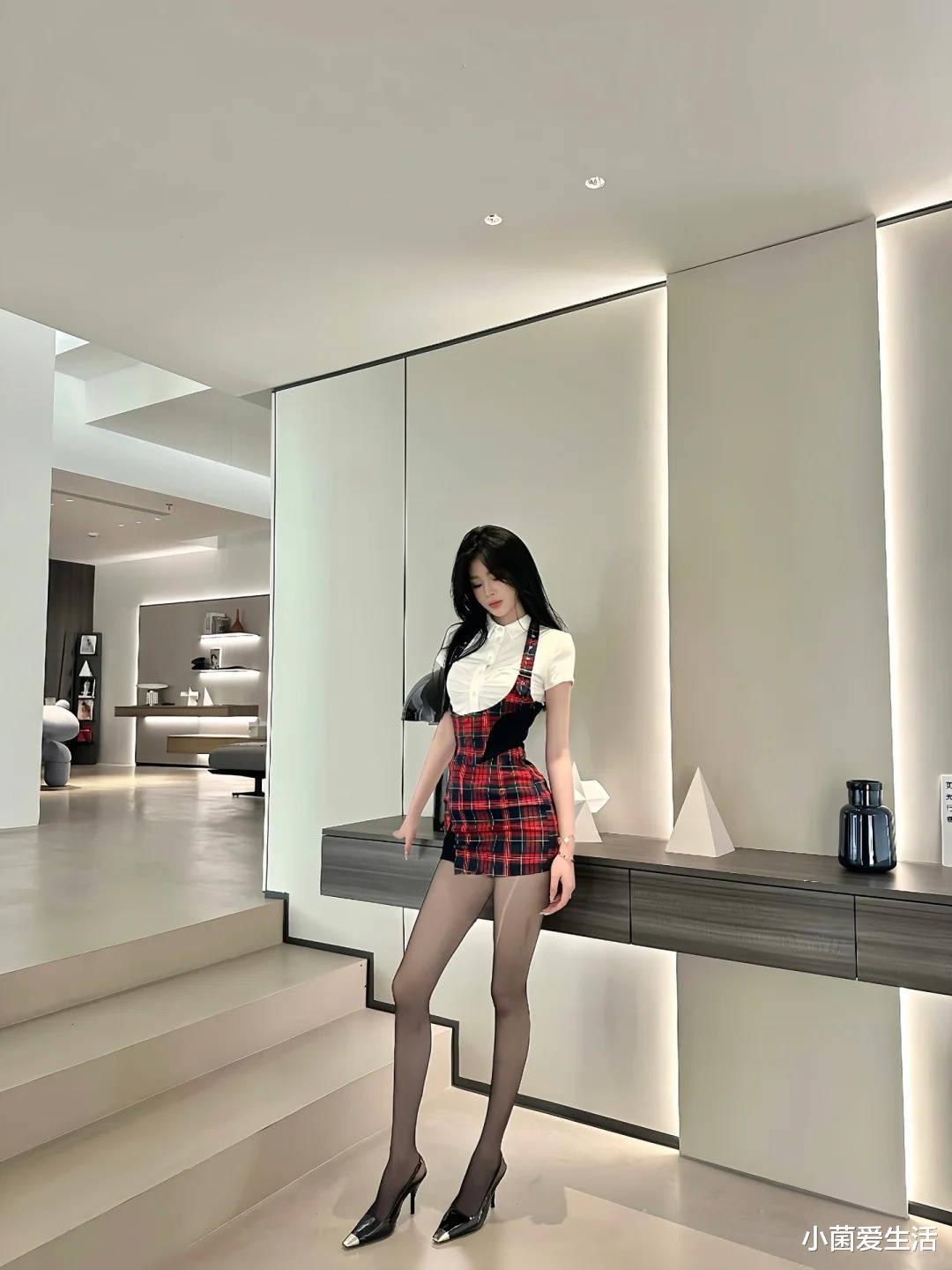 先来品品这身配色,经典黑白红三件套永不过时。白色短袖衬衫打底超显干净,重点全在这条红黑格子背带裙上!你们发现没?这种苏格兰格纹自带复古滤镜,膝盖以上的长度刚好露出大长腿,配黑色丝袜简直绝杀!脚上那双尖头高跟鞋我要重点夸,3cm的跟高既显腿长又日常,银色鞋头设计超有小心机~