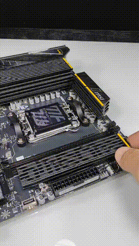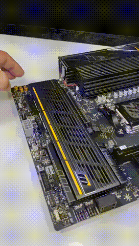 ▲ 内存插槽旁边的 M.2 散热模块采用第二代免工具 M.2 冰霜铠甲,实测单手就可以完成拆卸与安装。