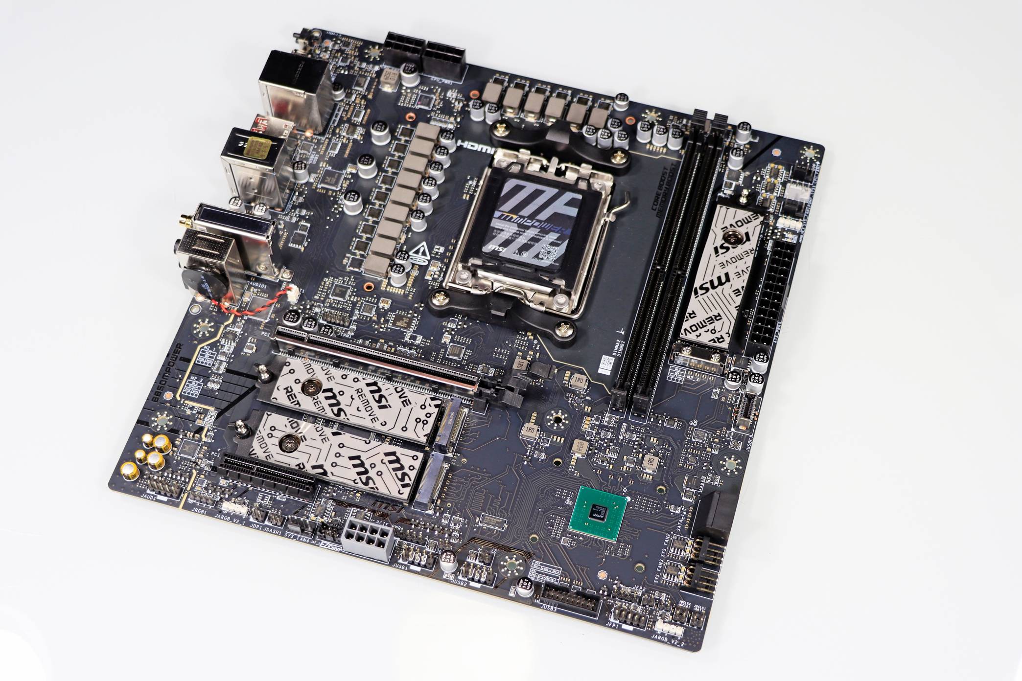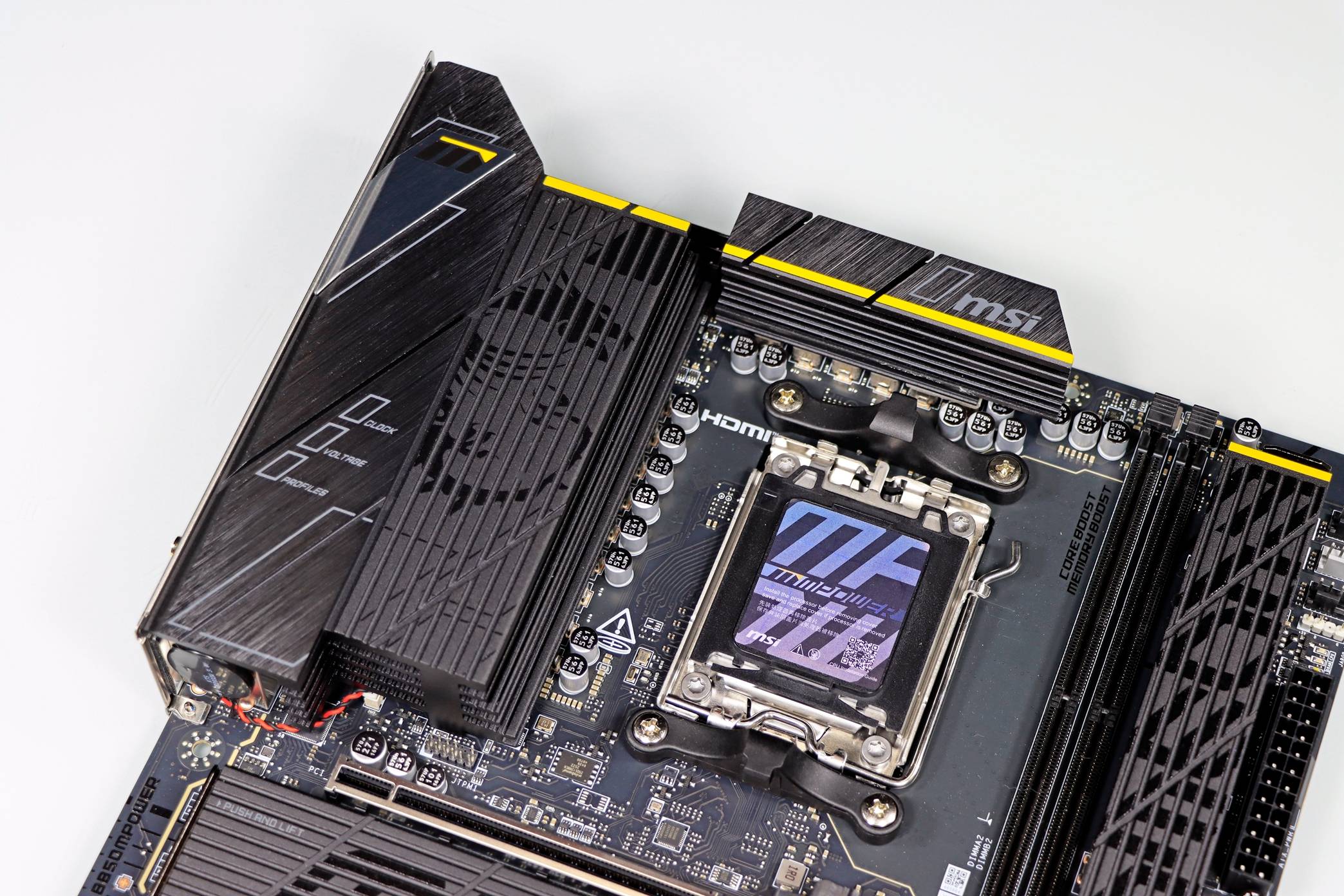 ▲ 拆掉扩展型 VRM 散热片之后,可以看到 VRM 供电,B850MPOWER 采用 12 (60A) +2+1 路智能供电设计,每一路都采用 Dr.Mos 数字供电模块 + 高品质的合金封闭电感以及黑金电容,可以为 CPU 输出最为纯粹的电脑,让 CPU 长时间维持巅峰性能输出。