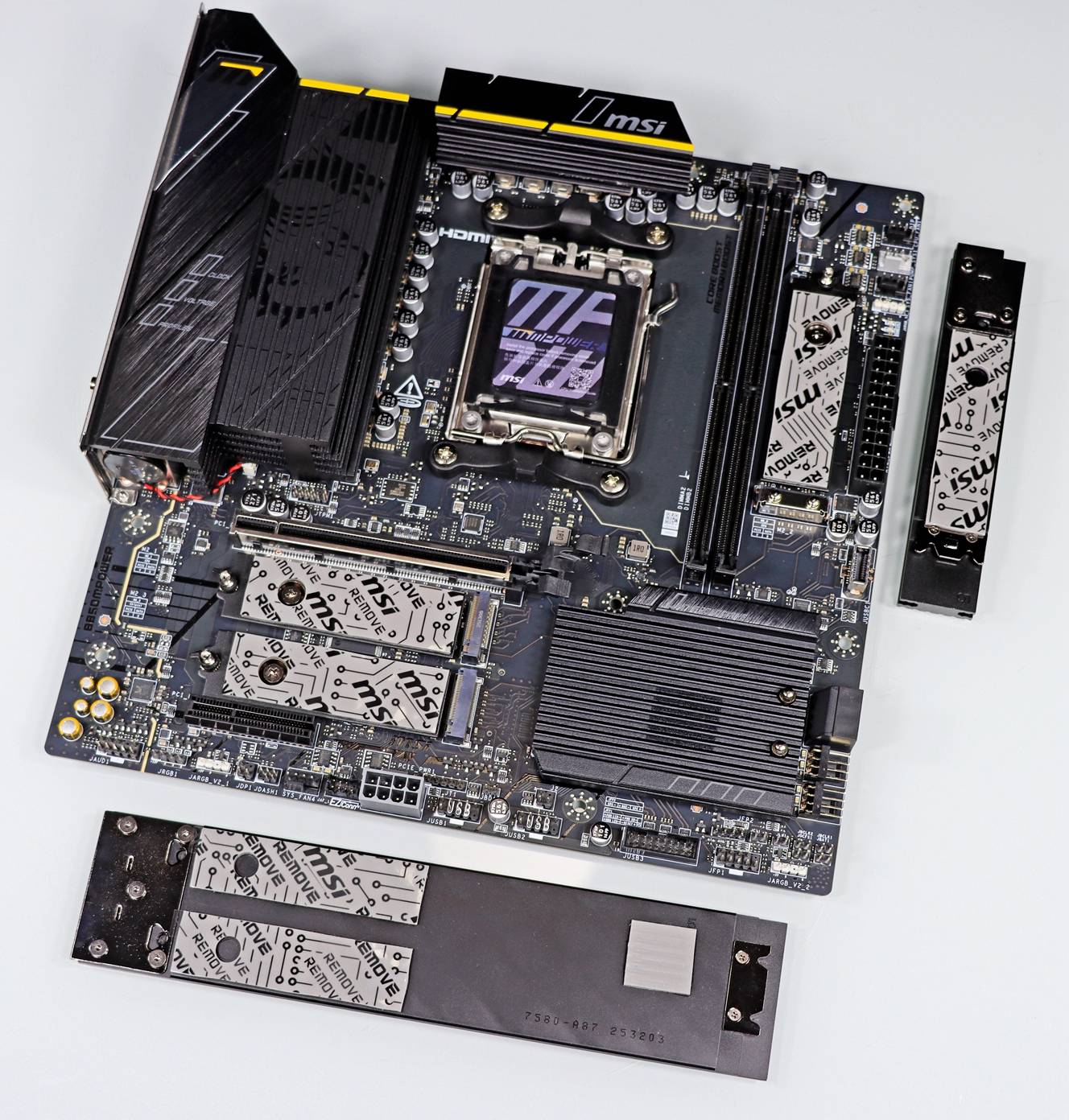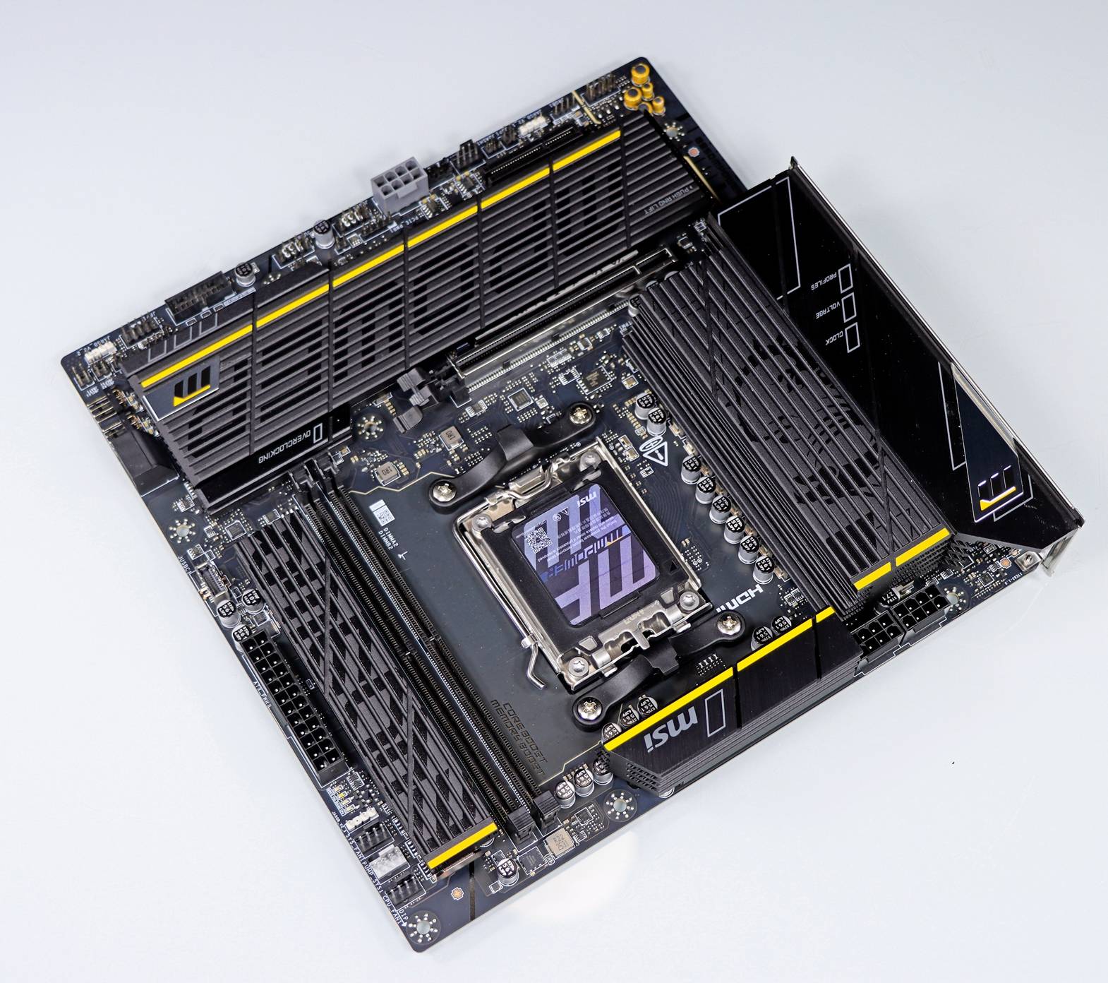 ▲ 来看看核心区域吧。扩展型 VRM 散热片上有着微星龙盾的暗纹喷绘,另外一个散热片上有着 msi 的标识。VRM 散热片与右侧的 I/O 盔甲自然而然二合一,可以更加好的保护 I/O 接口的背部。