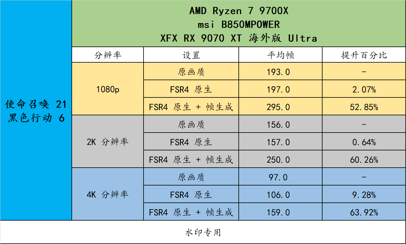 ▲ 《使命召唤 21 黑色行动 6》benchmark 实测。作为 FSR 4 的标杆游戏,这个游戏也对 AMD 显卡有着出色的优化,最新的黑色行动 7 出来了,不过目前没有 benchmark。