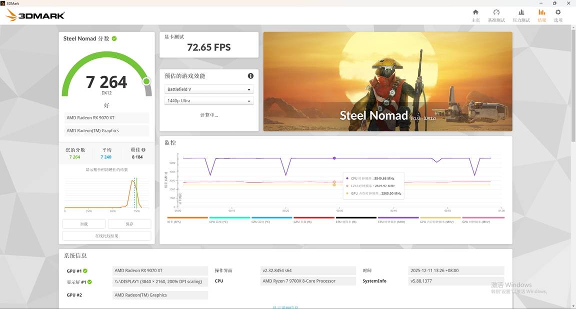 ▲ 9700X + B850MPOWER + XFX 9070 XT 海外版 Ultra 的 3Dmark Steel Nomad 性能测试。这是关于 DX12.1 的光栅性能测试。可以看到这套组合的性能超过了平均值。
