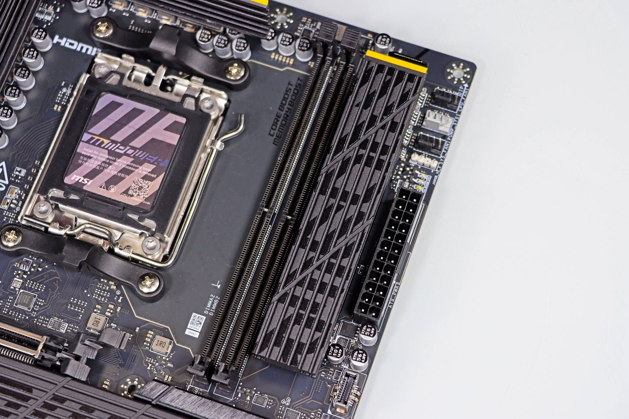 ▲ 在内存的下半区域有显眼的 MPOWER 暗纹大面积厚实散热模块,这是第二个 CPU 直连的 M.2 PCIe 5.0 X4 SSD 接口以及 M.2 PCIe 4.0 X4 SSD 接口 + PCH 的三合一散热模块。