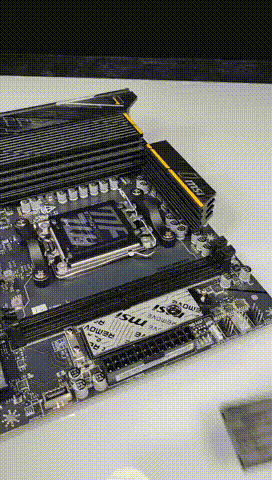 节省出来的空间用于配置 CPU 直连的 M.2 PCIe 5.0 X4 SSD 接口,在搭配的散热模块上有 MOPWER 的暗纹。