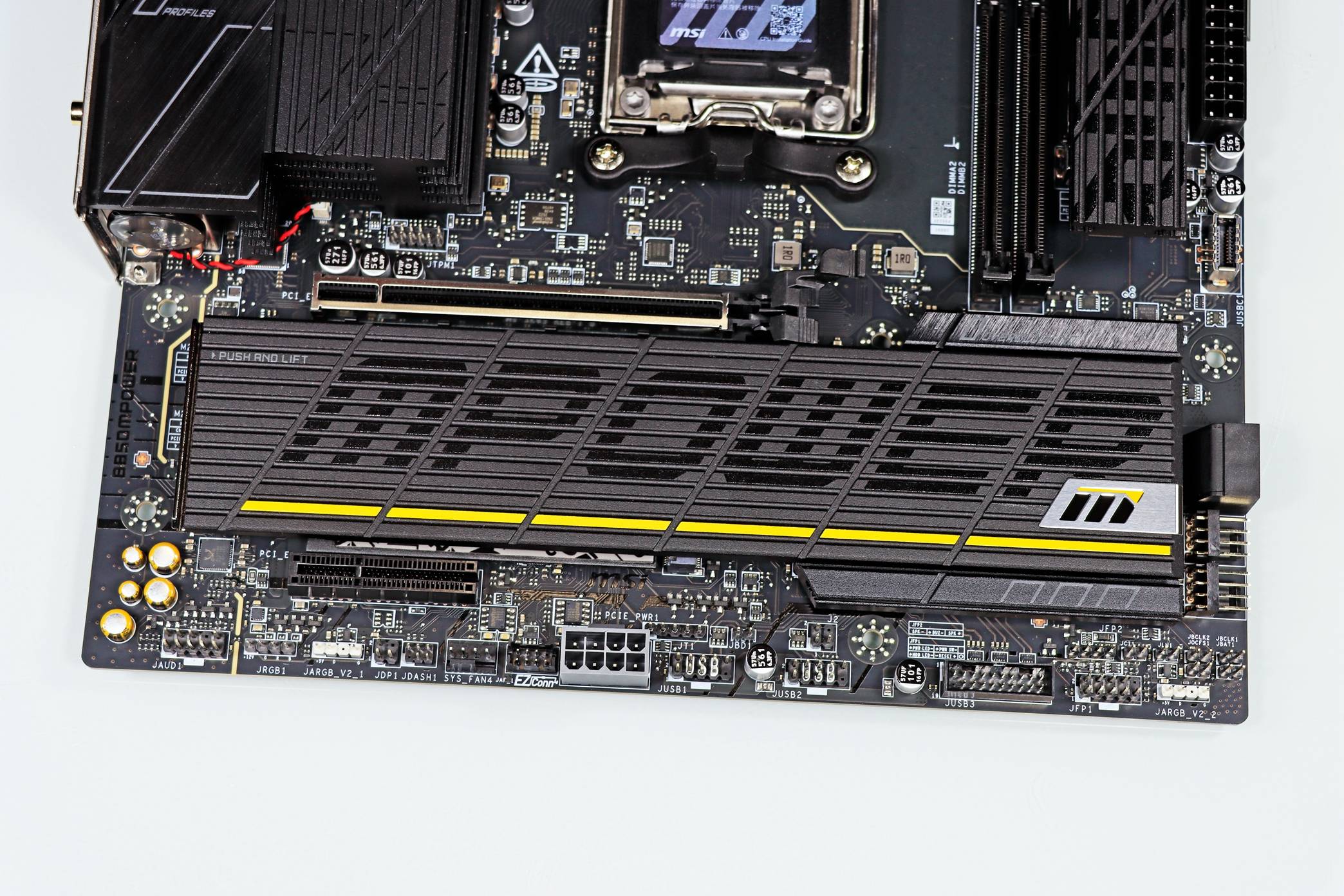 在主板底部与 PCH 芯片的周边有丰富的接口,得益于深厚的主板设计经验,msi 为主板配备了独立的 PCIe 8pin 供电,让扩展设备的供电更加稳定。