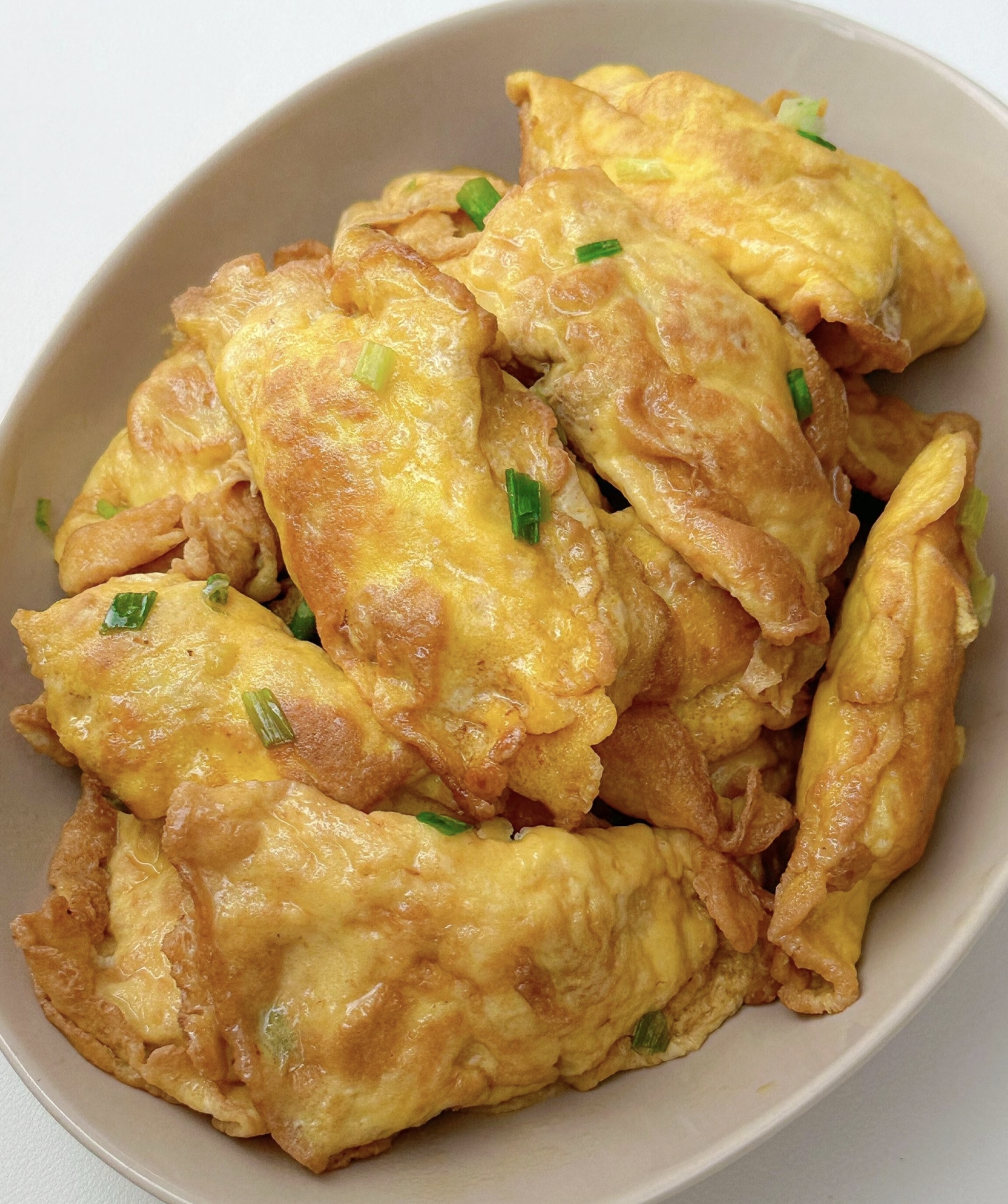 倒入1/4蛋液,迅速转动锅子让蛋液铺满锅底。看到蛋皮边缘微微卷起时,用筷子夹起一边对折,形成半月形。这时候要眼疾手快,趁蛋液未完全凝固时塑形。