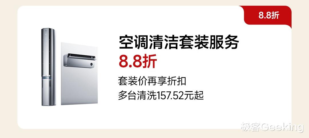 多台空调清洗可享 8.8 折,支持挂机和柜机,拥有多项套餐组合,比如挂机 2 台的活动价格是 157.52 元。