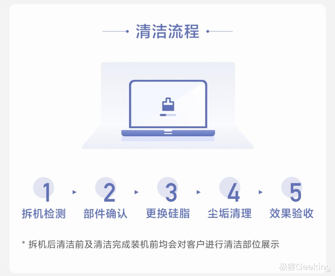 笔记本电脑深度清洁保养服务的内容包括产品外观和内部清洁,产品外观清洁包括外壳、键盘、屏幕和触控板等部位,内部清洁包括主板、风扇等的清洁,以及更换 CPU 和 GPU 的导热硅脂。