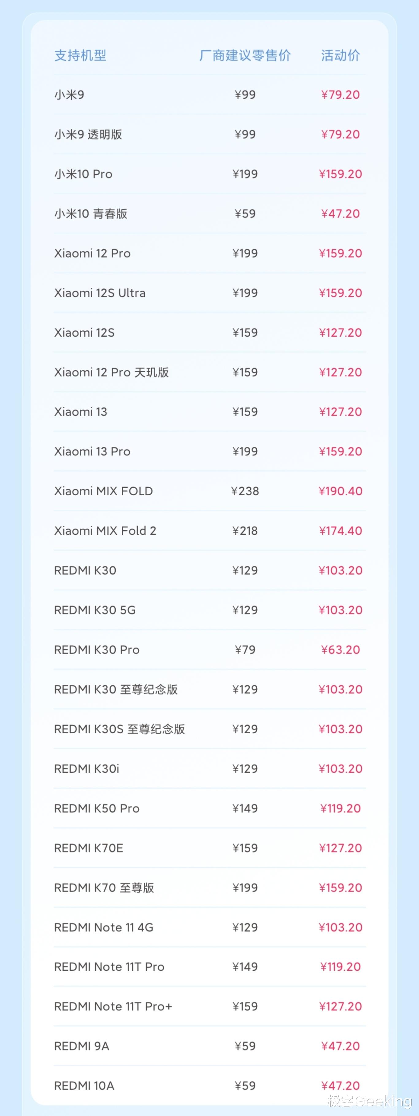 这也是被最多小米手机用户所关注的服务项目,此次手机电池 8 折换新支持了 26 款机型设备,活动价格是 47.2 元起,对比以往的 79.2 元起便宜了很多。完整的支持机型名单和对应的服务价格明细如下图:
