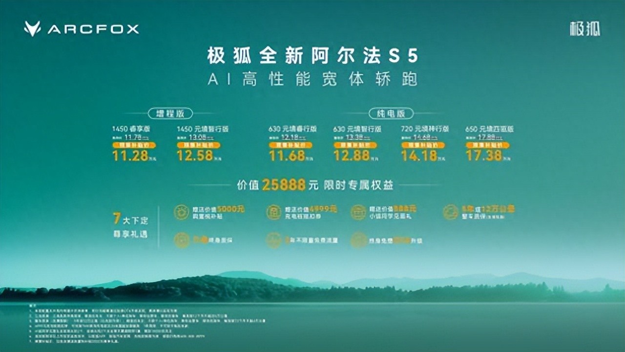 据了解,即日起下定全新阿尔法S5,用户可享受5000元购置税专项补贴、价值4999元家用充电桩抵扣券(安装服务以官方授权服务商为准)、包含高级舒适头枕和全景天窗遮阳帘在内的小狐同学见面礼、整车5年/12万公里质保、三电终身质保、3年免费不限流量和终身免费OTA权益等7重限时尊享礼遇,总价值至高25888元。