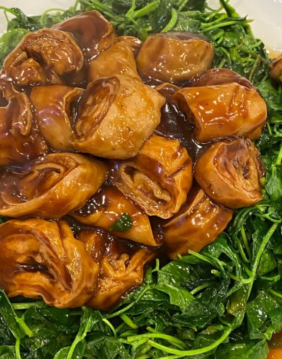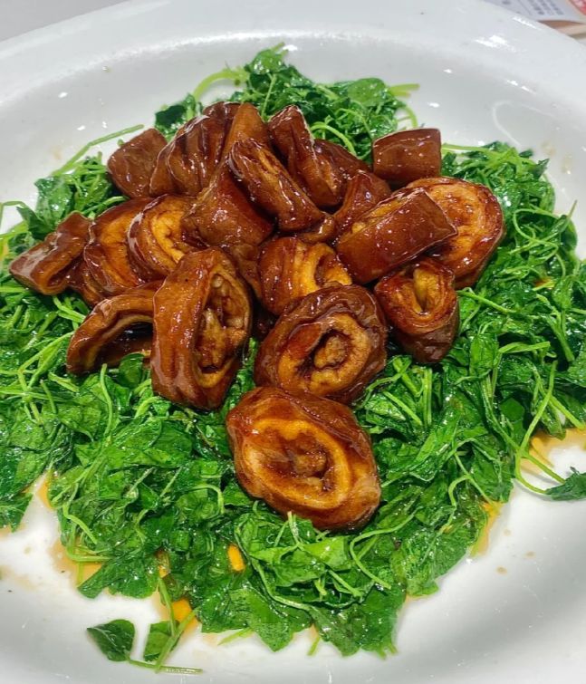 这道菜上桌时,色泽对比强烈——草头的翠绿,圈子的酱红,汤汁的油亮。先夹一筷草头,野菜的清新中带着圈子汤汁的醇厚;再尝一块圈子,酥软入味,肥而不腻,草头的清香恰好化解了内脏的厚重。这种荤素搭配、浓淡相间的智慧,正是本帮菜“浓油赤酱却不失清雅”的典型体现。吃这道菜最好配一碗白米饭,酱汁拌饭,能吃出最朴实的满足。
