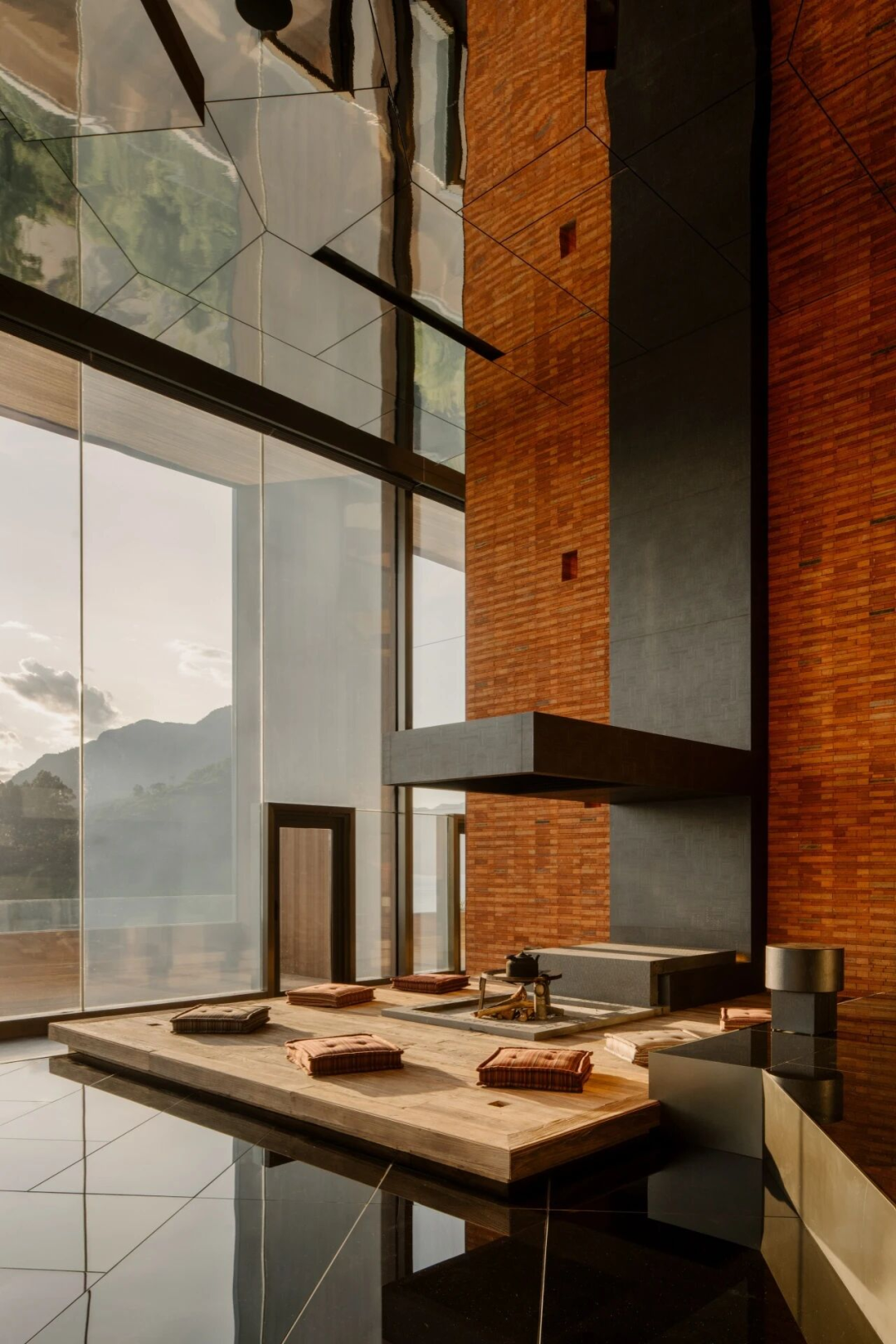 其西向大堂采用整面落地玻璃,将湖景与天光引入室内。空间以温润石材、深色木质与简洁线条构筑,色调宁静克制,与外部自然韵律相呼应。