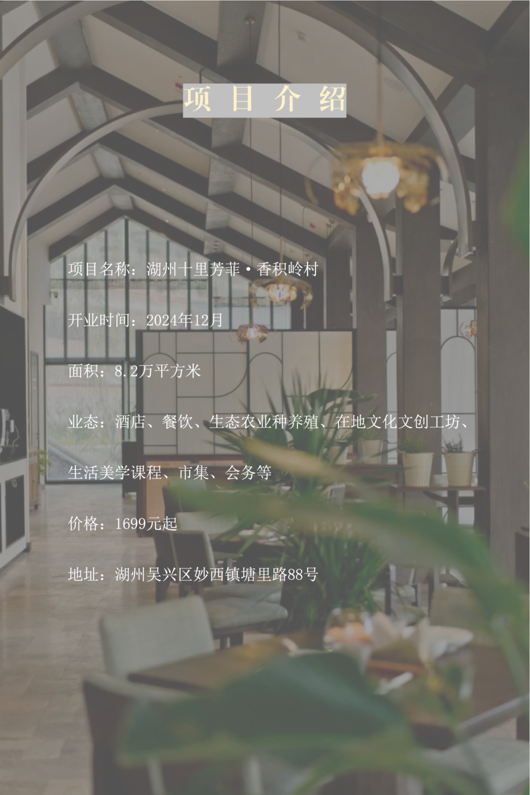 湖州十里芳菲·香积岭村,是杭州十里芳菲文旅集团发展到3.0时代的又一个落地村落。它不仅承载了多元的文化商务体验,更是一个融合了香草交易市场、香草生活方式、香草上下游产业的创新平台和「乡漂漂」社区。