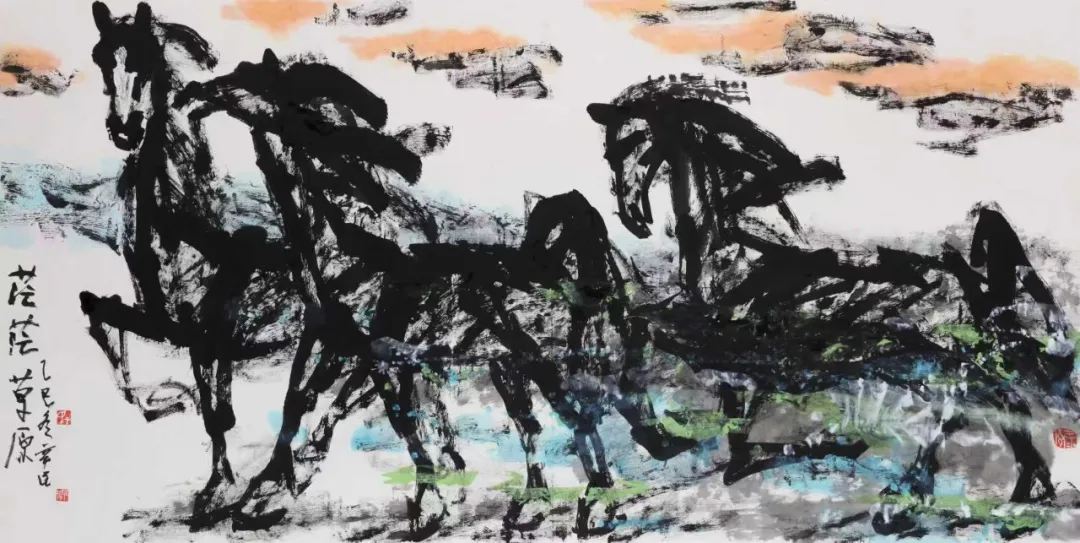色彩运用的突破性与生命力,是齐辛民画马艺术的另一大亮点,也是“齐家样”美学体系的重要特征。在中国传统大写意绘画中,色彩多为笔墨的辅助,以墨为主、以色为辅的创作理念长期占据主导,即便是郎世宁等中西融合的实践者,其色彩运用也未能脱离“服务于形”的局限。齐辛民则打破了这一陈规,将色彩提升到与笔墨同等重要的地位,以极具个性的色彩表达构建起独特的视觉体系,使色彩成为传递情感、彰显精神的重要载体。