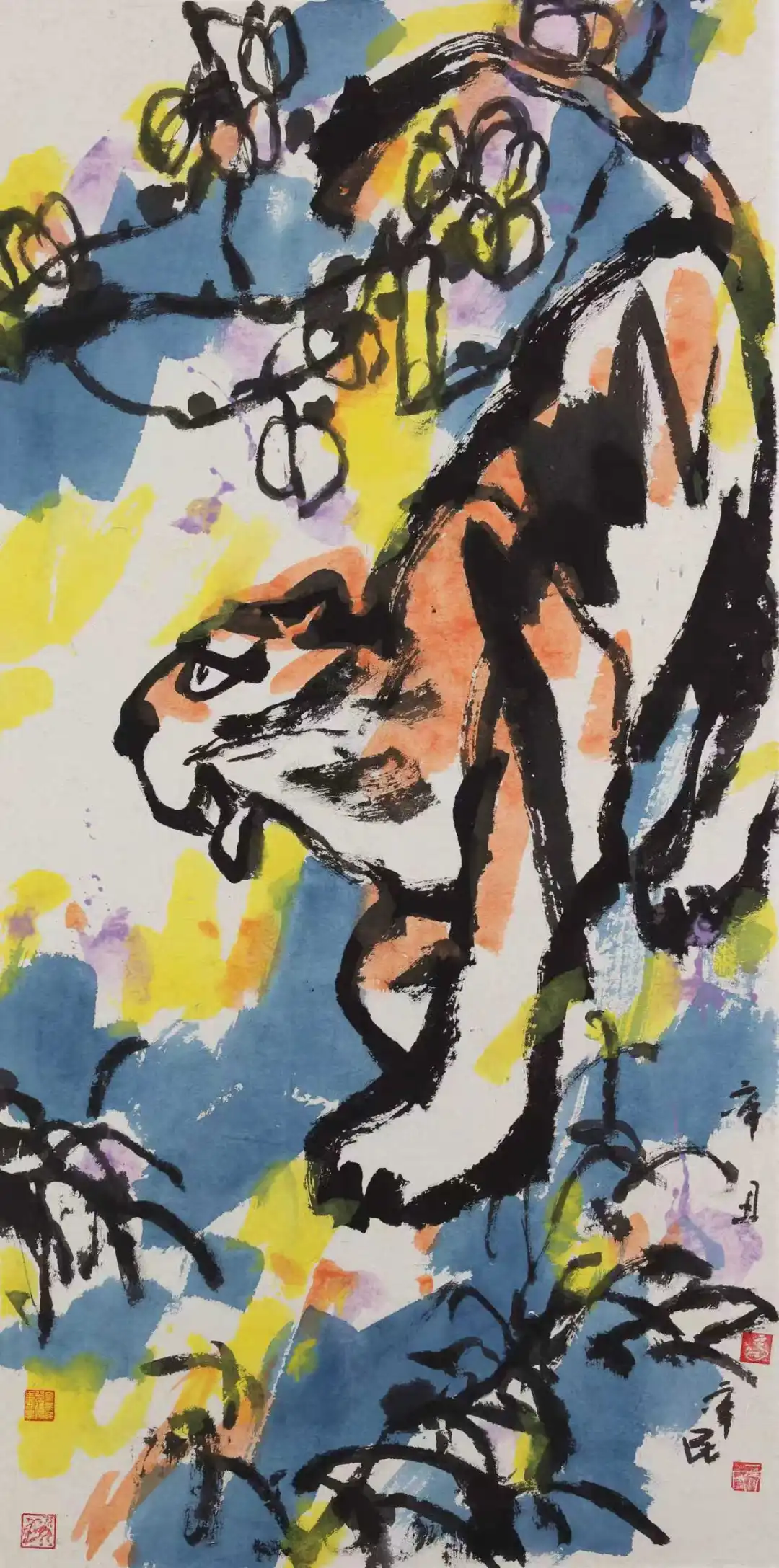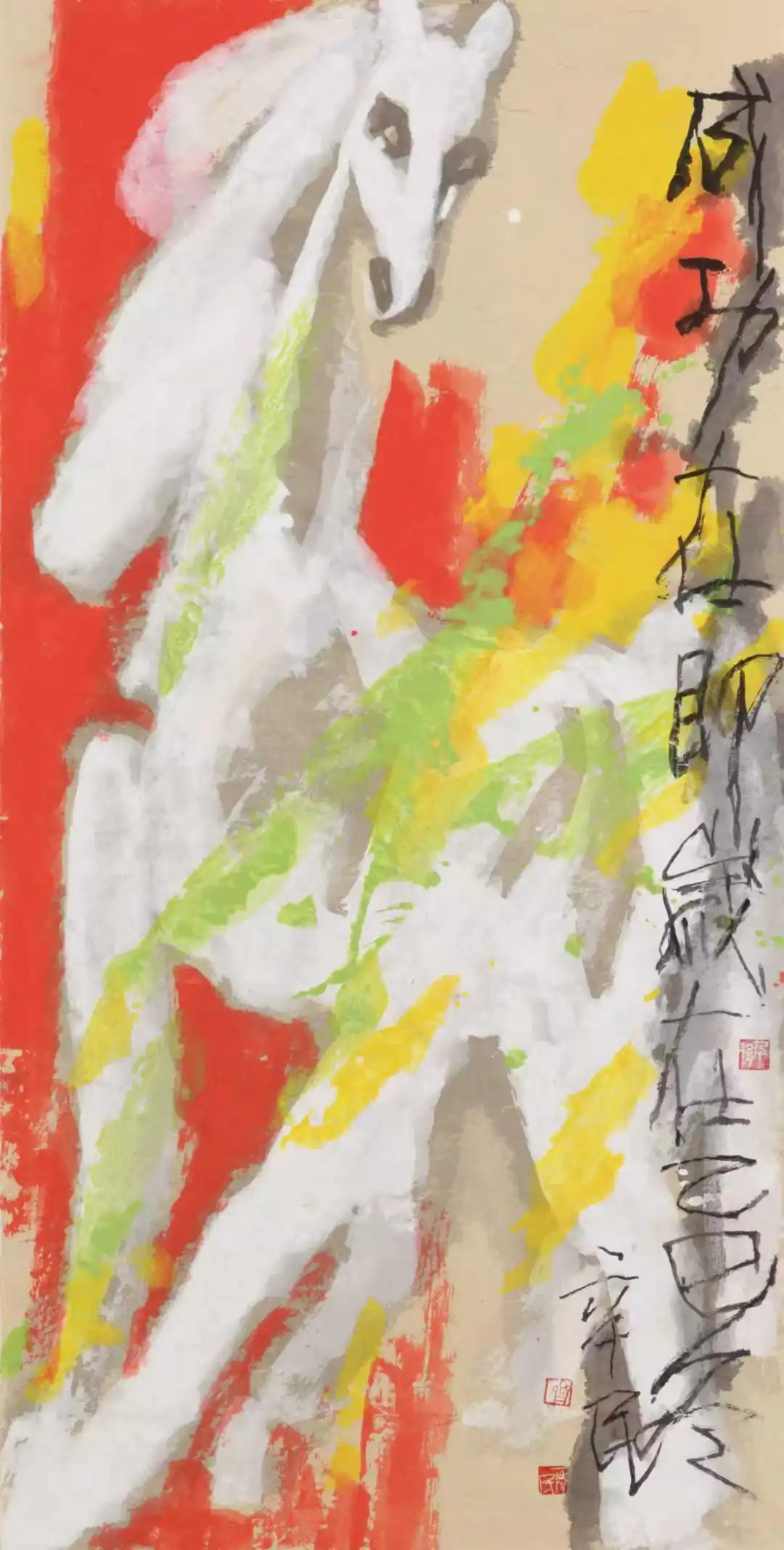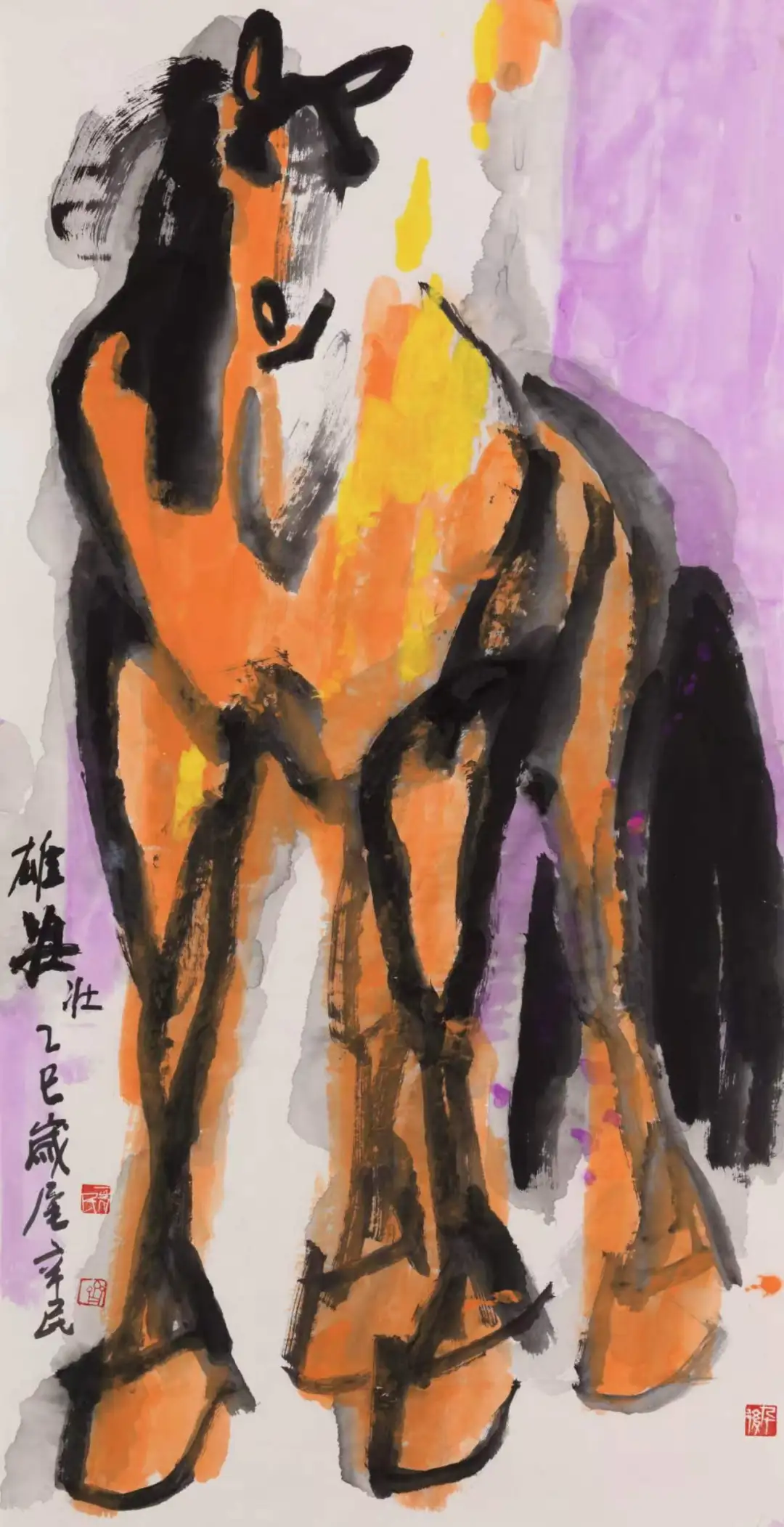他的色彩运用兼具传统民间艺术的质朴与西方印象派的灵动,既吸收了中国传统剪纸的鲜明对比,又借鉴了西方绘画的色彩表现方法,大胆而不失法度。创作中,他常以三原色直接入画,或用生色代墨,或用五彩衬托,使画面色彩明丽鲜亮却不媚俗,浓墨重彩却不滞涩。在丙午发的马画作品中,色墨浑融又笔笔清晰,看似杂乱却主次分明,如七彩交响般富有韵律感,既烘托了画面气氛,又强化了马的精神气质。这种色彩运用绝非简单的形式创新,而是齐辛民“以色彩观照世界观”的艺术表达,他用满纸斑斓为心中的世界画像,色彩中流动着对生命最浓郁的情感渲染,形成了“形而上”的色彩美学。这种色彩的生命力,不仅让作品具有强烈的视觉冲击力,更使传统大写意绘画在现代审美语境中获得了新的生命力,实现了古典与现代、东方与西方的和谐共生。