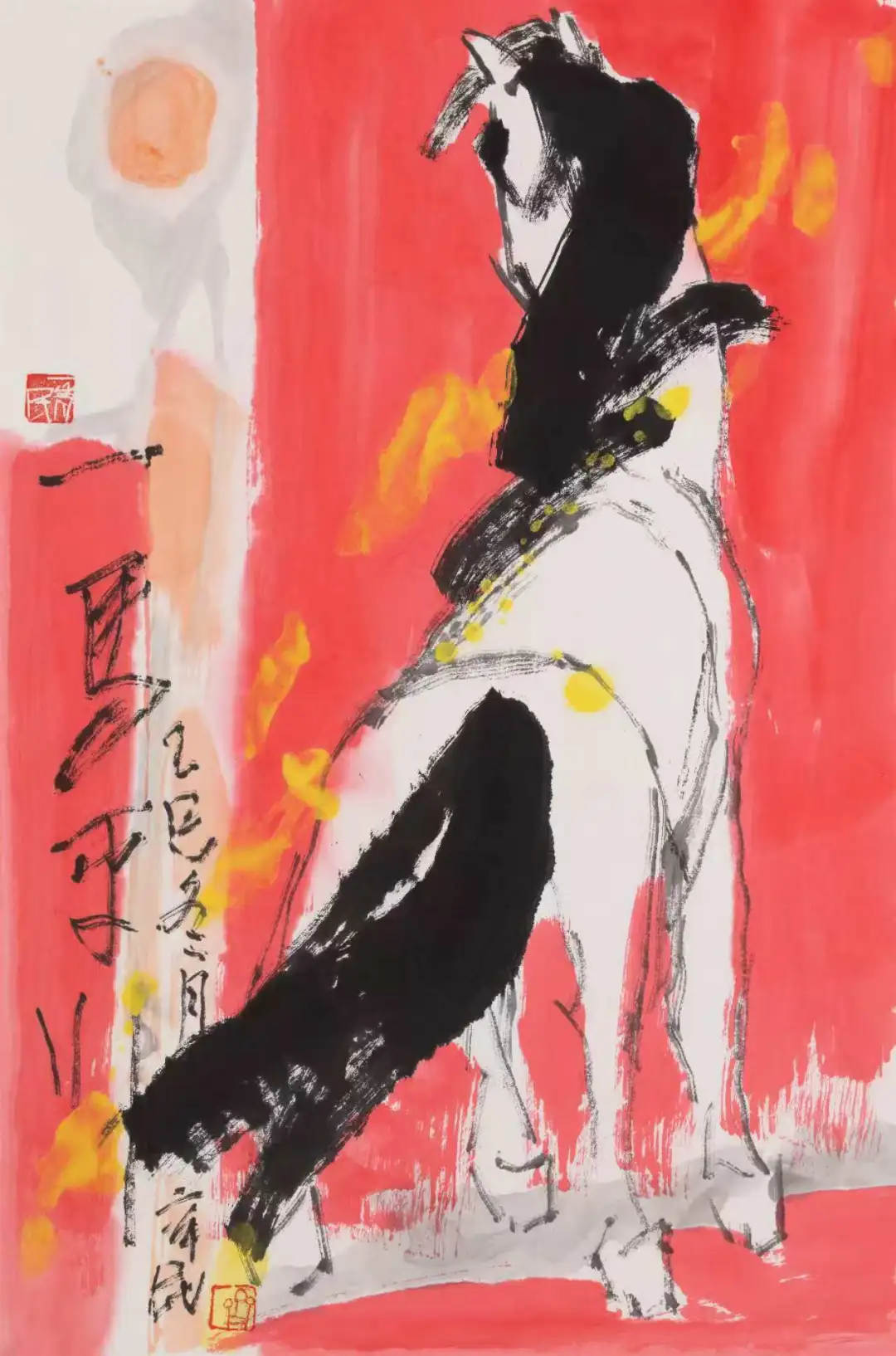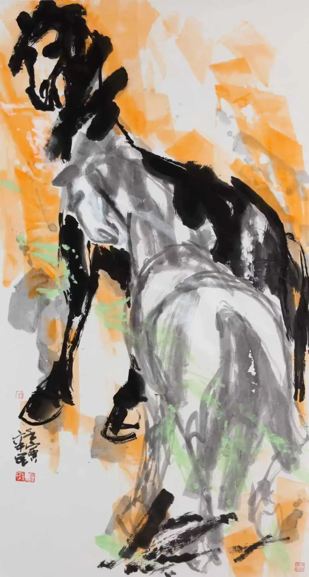 齐辛民大写意之“大”,首先体现在气象的宏阔与精神的沉厚。孟子曰:“充实之谓美,充实而有光辉之谓大,大而化之之谓圣,圣而不可知之之谓神。”这一论断恰可诠释齐辛民画马艺术的精神内核。纵观其丙午发的马画作品,无论是丈二巨制还是盈尺小品,皆透着一股吞吐天地的浩然之气。不同于韩干、李公麟笔下马的写实工致,也区别于徐悲鸿奔马的“似与不似之间”,齐辛民的马彻底挣脱了物象形态的束缚,以更为抽象的点、线、面为基本元素,构建出充满力量感与精神张力的艺术形象。他多用粗线、大块面的笔墨语言,寥寥数笔便立骨塑形,一笔定姿态,两笔见风骨,三五笔即成一匹桀骜不驯的奔马,删尽冗繁,留取真魂,真正达到了大写意“少少许胜多多许”的至高境界。