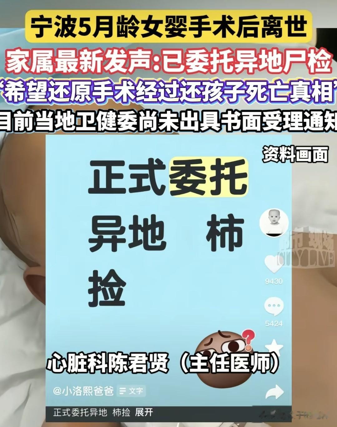 最近,浙江宁波5月龄小洛熙的事牵动了全国网友的心,因为被确诊静脉窦型心房间隔缺损,在宁波市妇女儿童医院进行手术,本来主治医生陈某说就是个小手术微创,最多不超过2个多小时,还给小洛熙妈妈说我手成(每年都做)。结果手术持续了7个多小时,在医院重症监护室宣告死亡。
