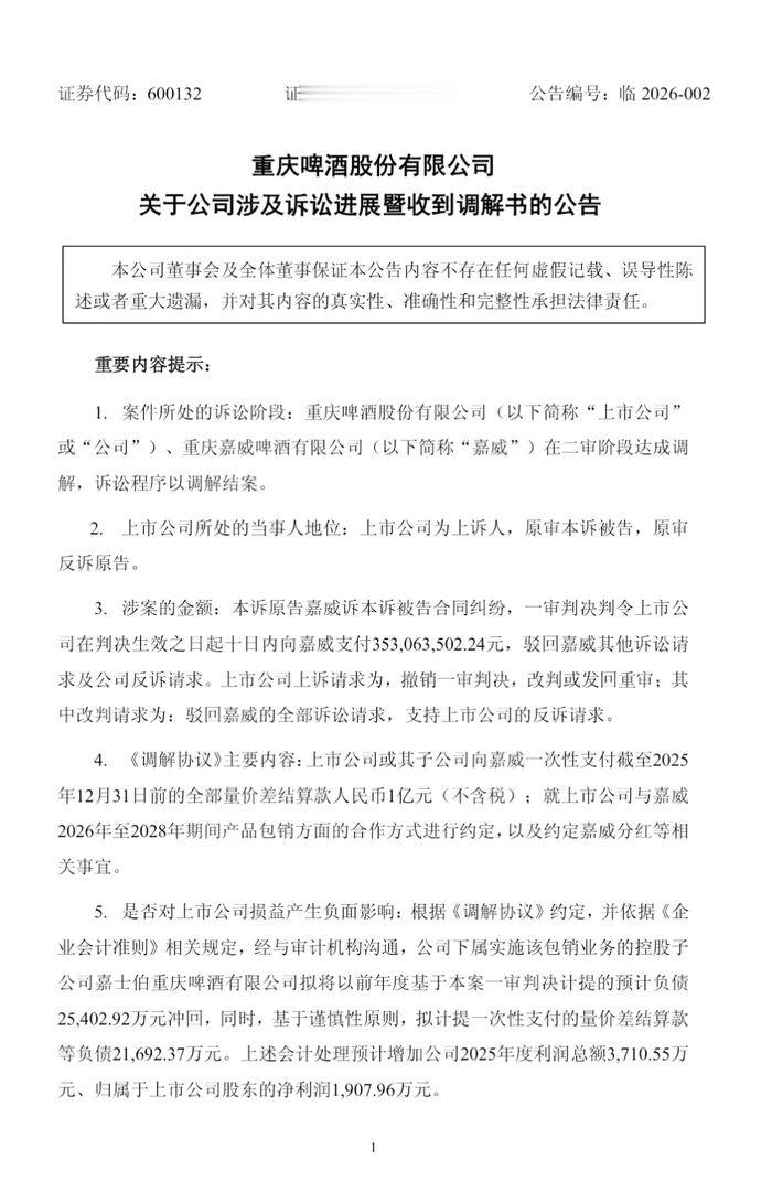 重庆啤酒1月6日公告内容显示,经过重庆市高级人民法院调解,双方协商签订《调解协议》。重庆啤酒向重庆嘉威一次性付截至2025年12月31日前的全部量价差结算款人民币1亿元(不含税);双方还对签订2026年至2028年期间产品包销方面的合作方式、重庆嘉威分红等事宜进行约定。