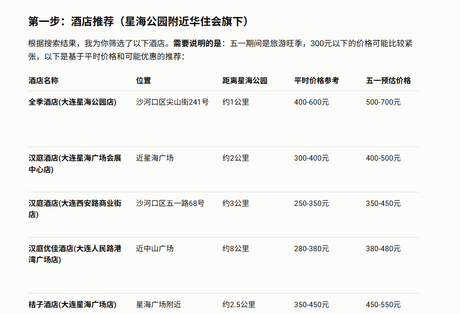 我本来的酒店预算是 300 元内,但没考虑到五一黄金周的酒店普遍会涨价。悟空不仅帮我「想」到了,还给出了平时价格参考以及五一期间的预估价格。