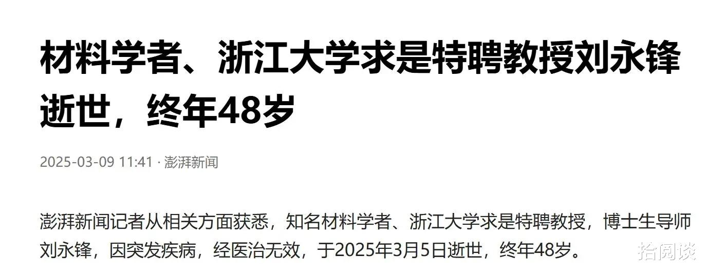 因突发疾病意外离世的年仅48岁的大S;因操劳过度出现气胸,意外离世的年仅41岁的音乐人方大同;因突发疾病离世的年仅48岁的浙大教授刘永峰等等,还有很多。