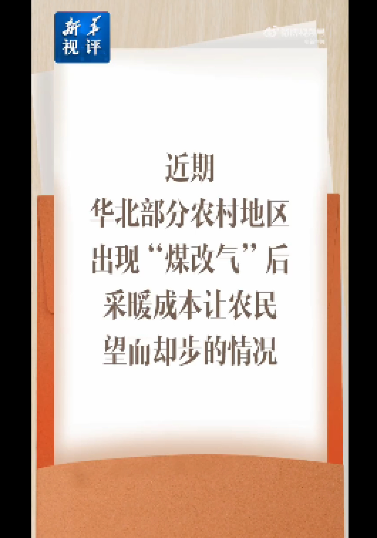 1月5日,《新华视评》与《央视网评》相继发声,指出华北部分农村地区在“煤改气”后面临采暖成本高昂的困境。评论称,不少农村老人守着直冒冷气的屋子,裹着厚棉衣缩在炕头,即便室内寒冷,也不敢开启天然气暖气。
