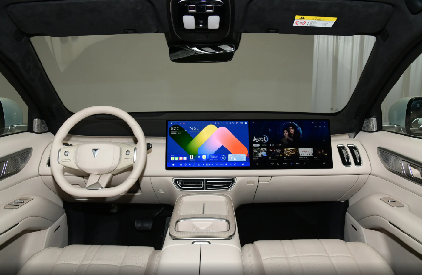 来到车内之后,依然是没有传统仪表的设计风格,但这一次给副驾驶也提供了一块大尺寸的娱乐屏,并且再搭配上鸿蒙OS车机操作系统,整体的流畅性,以及互联体验还是比较不错,符合当前新能源市场的主流。不过较为遗憾的是,既然是一台大大方方的大型家用SUV,为什么不能把主副驾驶的化妆镜尺寸做的再大一些?而且它的补光灯也只有单侧配备。除此之外,深蓝S09的前排中央扶手也是一个支持加热/冷藏/冷冻的车载冰箱,能够提升用户的日常用车体验,同时也符合当下内卷的汽车市场环境。