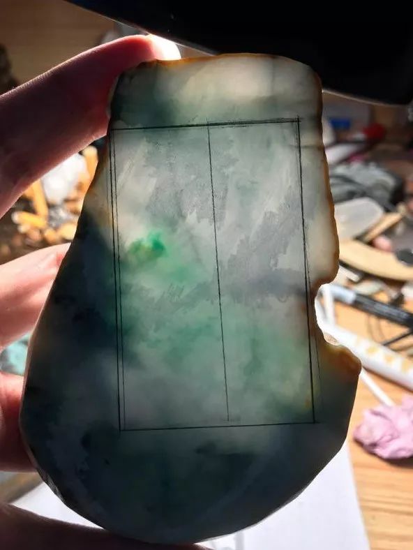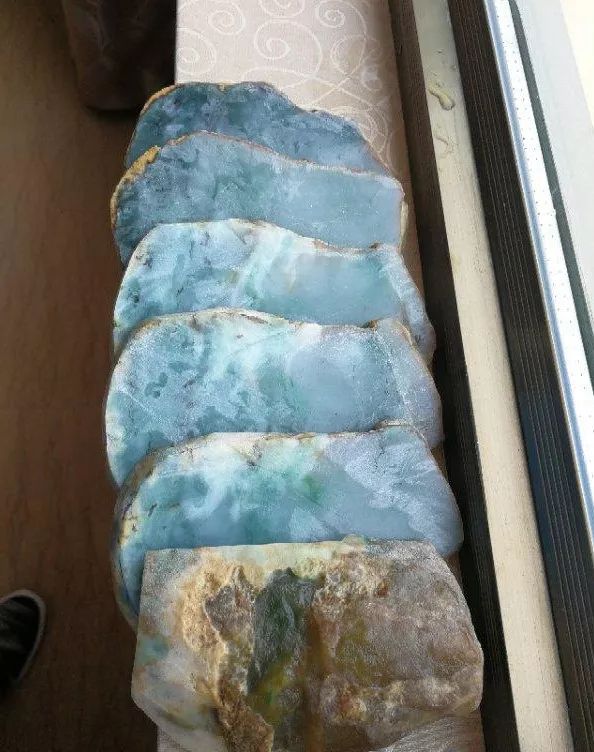 按照原石厚度货主一共切了5刀,来看看放在窗台上的6块片料这无疑是涨了,在透过自然光线的照射下,每一块料子上的飘花都展现了出来,运气好的是没有裂痕,这样起货是相当容易的。
