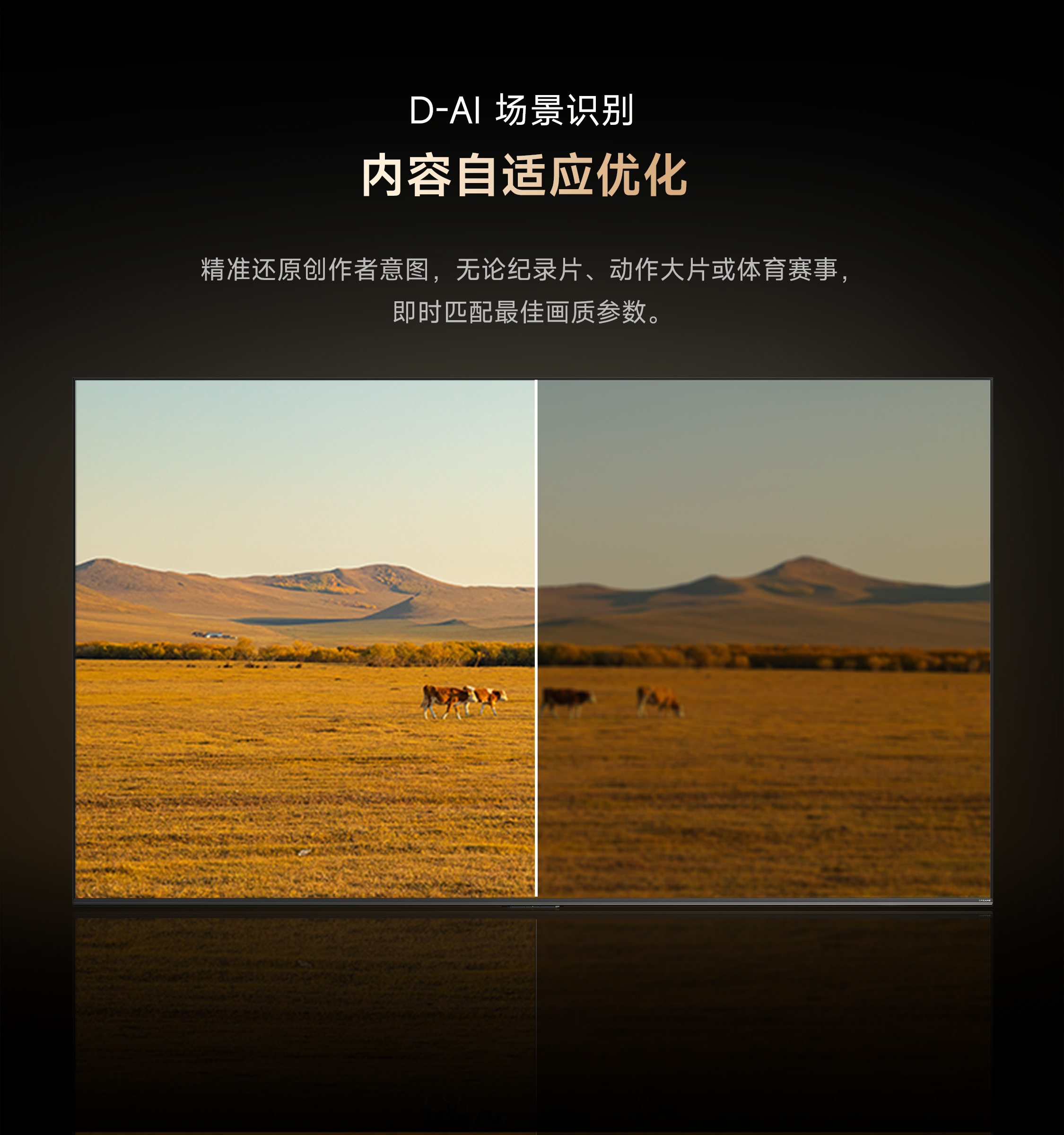 然而,让这块顶级画布“活”起来的,是它的灵魂——Dreamind™Pro AI画质芯片。传统电视只是被动显示信号,而V3000则能主动思考。通过接入大模型能力,它能实时智能分析输入片源的每一帧,无论是老电影的噪点,还是低分辨率网络视频的模糊,AI都能进行深度优化,智能增强细节、动态调整对比度与色彩饱和度,甚至能将画面内容智能适配到最佳模式。这意味着,无论您观看的是什么质量的片源,V3000都能通过AI计算,为您呈现出生动、清晰且富有层次的臻彩效果。