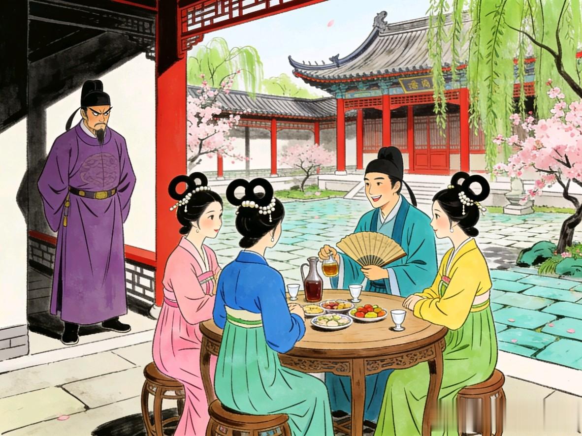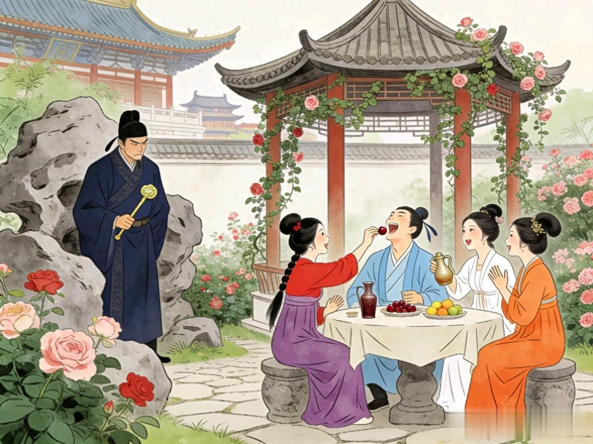 他最宠爱的四位姬妾:瑶月夫人、筑玉夫人、宜笑姐、餐花姨姨,正围着一个青衫书生饮酒作乐。那书生不是别人,正是他三年前收留的门客柳文渊!
