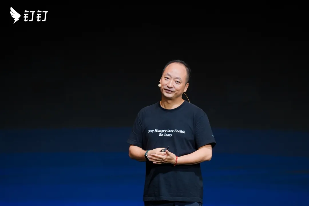 钉钉十周年发布会上的无招,他的短袖上写着“Stay hungry, Stay foolish, Be crazy”