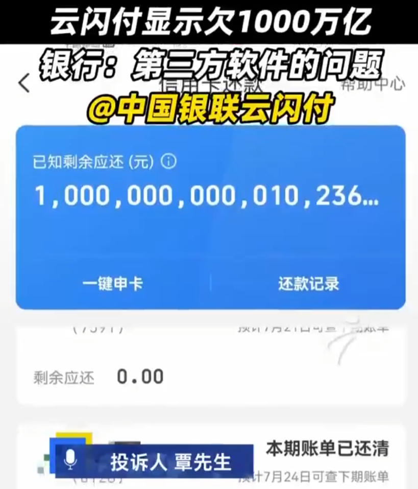 屏幕上的数字是1,后面跟着15个零:1,000,000,000,000,000。这是覃先生在云闪付上看到的光大银行“乐惠金”准贷记卡欠款数额。