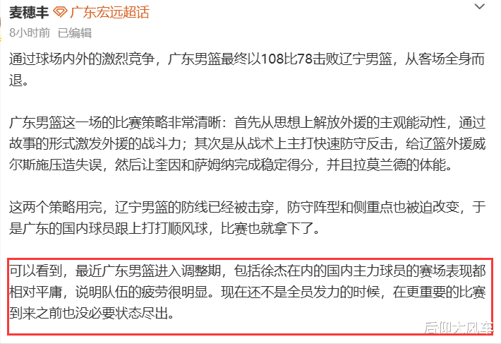 麦记所言非虚,也是相对客观的说出了广东队目前的处境,尽管昨晚广东轻松大胜了辽宁,但其实球队现在还没有达到最佳状态,徐杰和胡明轩其实都比较疲劳,胡明轩膝盖有伤一直是边打边养,徐杰近期也是换上了流感,身体状况比较一般,辽粤战虽然是传统恩怨局,广东队赛前无论是备战还是从球员采访中都能看出他们对这场比赛的重视程度,但理性来说,现在并不是广东队全员发力的时候,毕竟还有2/3的赛程要打,没必要在这种时候发挥出全力,把对手打急眼,以免影响了后续的比赛,您觉得呢?