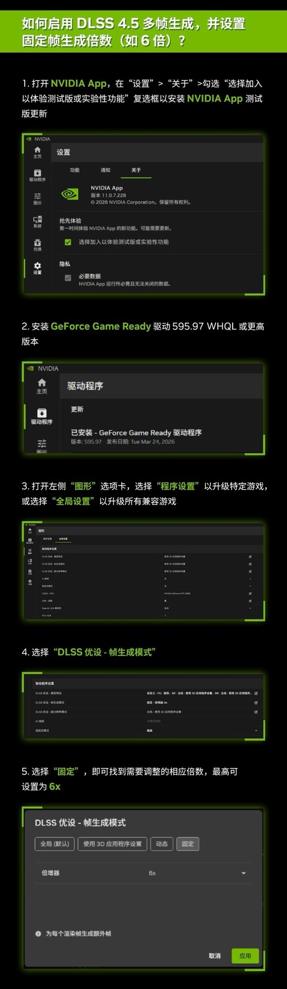 换言之,它会根据你设定的帧率或匹配显示器刷新率,仅生成必要的帧,无论你的显示器是 120Hz、144Hz、240Hz 或更高。如何开启DLSS4.5 动态多帧生成呢?一图看懂~