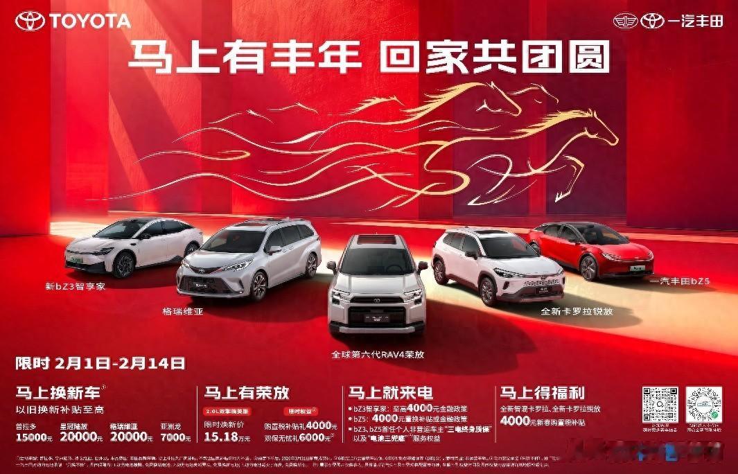 年味渐浓,归途可期。一汽丰田以一份诚挚礼遇,守护每个家庭的团圆之旅。2月1日至2月14日,一汽丰田推出限时活动,皇冠陆放、格瑞维亚等明星车型享至高20000元的置换补贴;全新第六代荣放限时焕新价15.18万元起,并可享4000元的购置税补贴和6000元的双保无忧礼;纯电“双子星”bZ3智享家和bZ5至高享4000元购车补贴和“三电终身质保”“电池三兜底”的服务权益;全新智混卡罗拉、全新卡罗拉锐放也可享4000元新春购置税补贴。