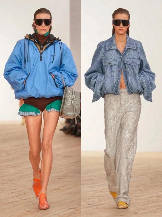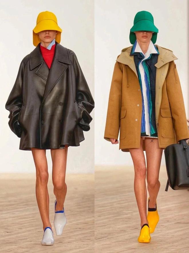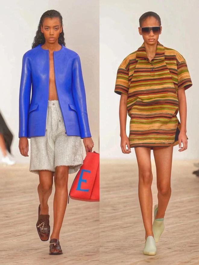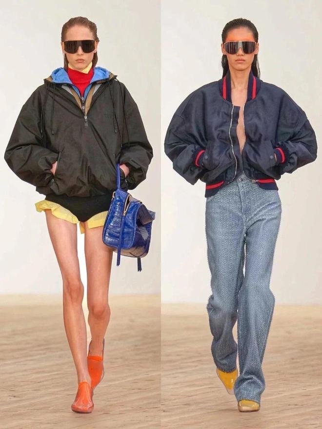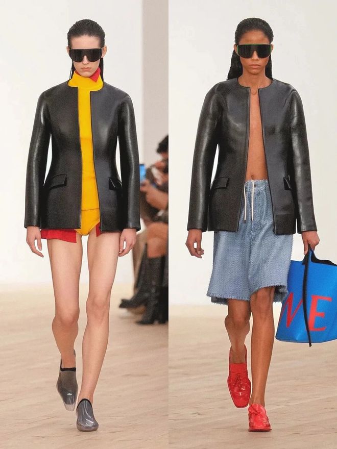 比如秀场图4的搭配就很有启发:黑色外套做“主心骨”,里面藏着蓝色连帽衫、红色高领打底,下半身配柠檬黄短裤,再用橙色鞋子、宝蓝色皮包收尾。