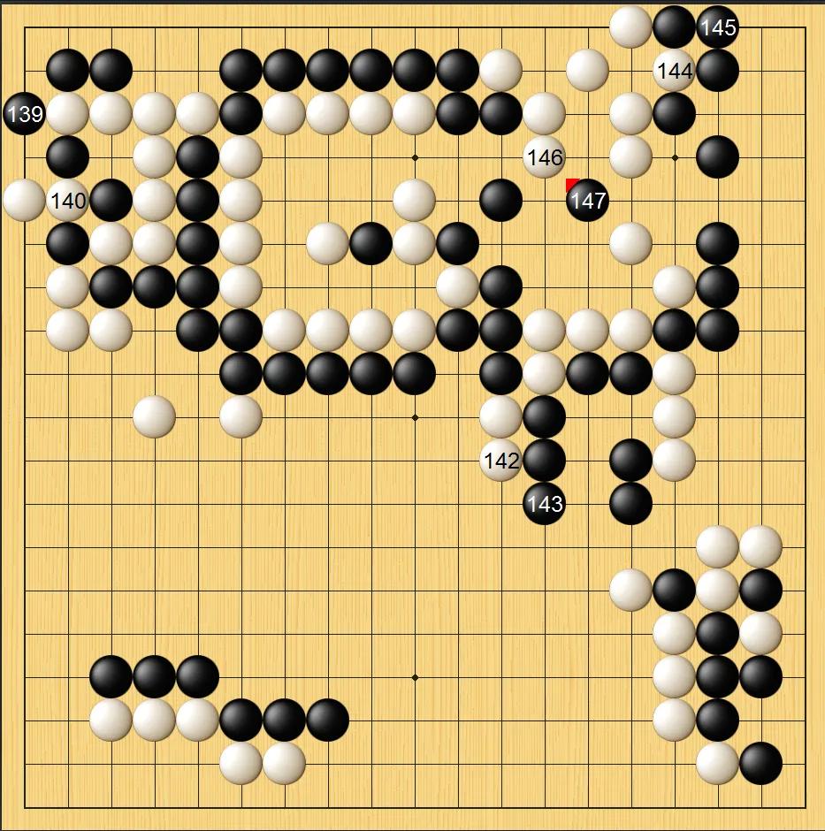 黑棋在左上角寻找到比较丰富的劫材,这个劫打得游刃有余。到黑第145手,王星昊粘了,此时白棋胜率仅剩4.5%。