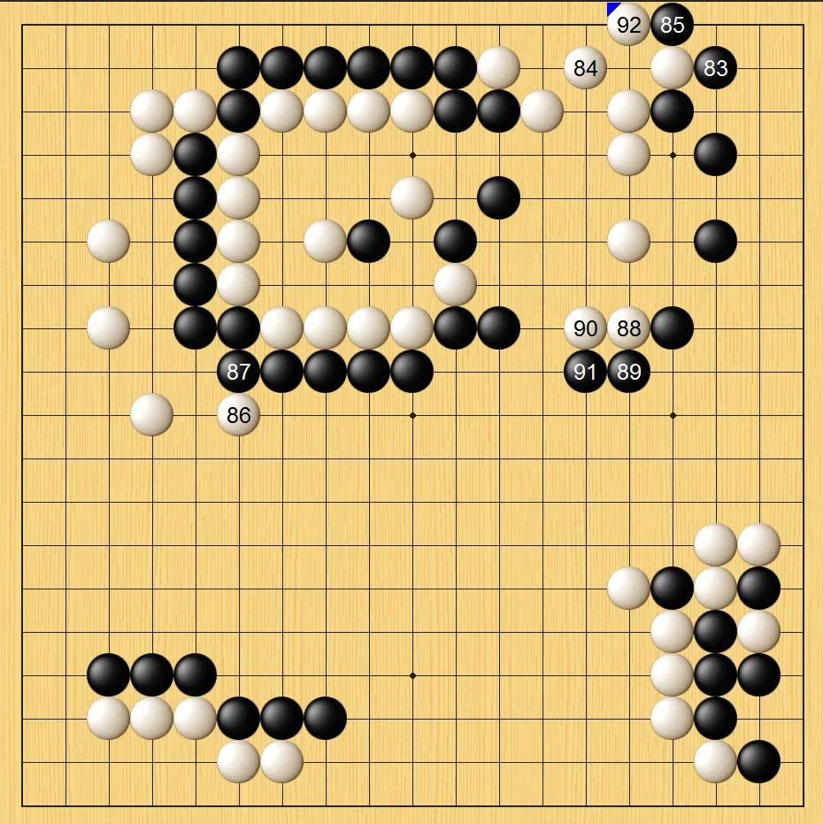 王星昊的黑棋第91手占据绝对要点,封住右上方白棋大龙,申真谞第92手主动开劫。