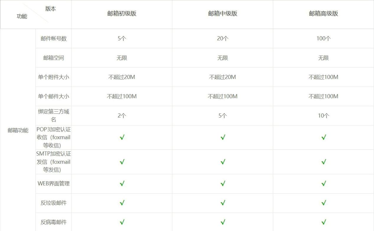 阿里云企业邮箱:以5账号为起售单位,标准版年价600元,AI尊享版年价900元,仅AI尊享版有“买三年送三年”优惠,优惠后年均价450元,无其他长期买赠活动,多用户协同需额外升级套餐,长期使用成本偏高。